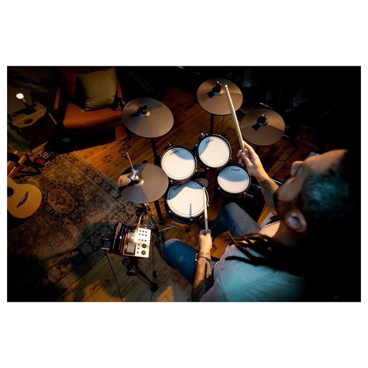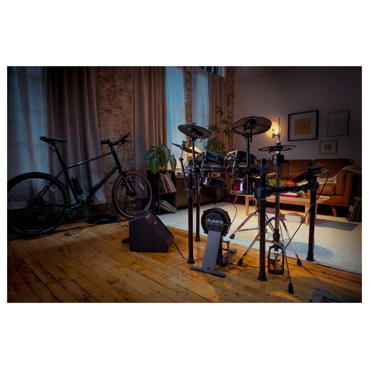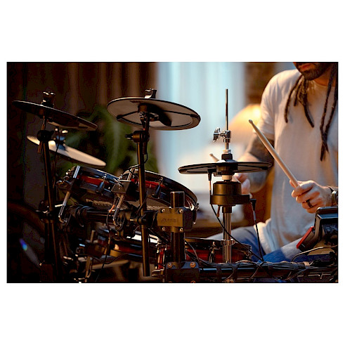 The Alesis Nitro Ultimate is a nine-piece electronic drum kit designed for ultimate playability. This kit includes a stand-mounted hi-hat controller, dual-zone cymbals with choke, dual-zone mesh toms and snare, and a mesh kick drum tower with kick pedal—all in a flexible, responsive setup for any style of drumming.