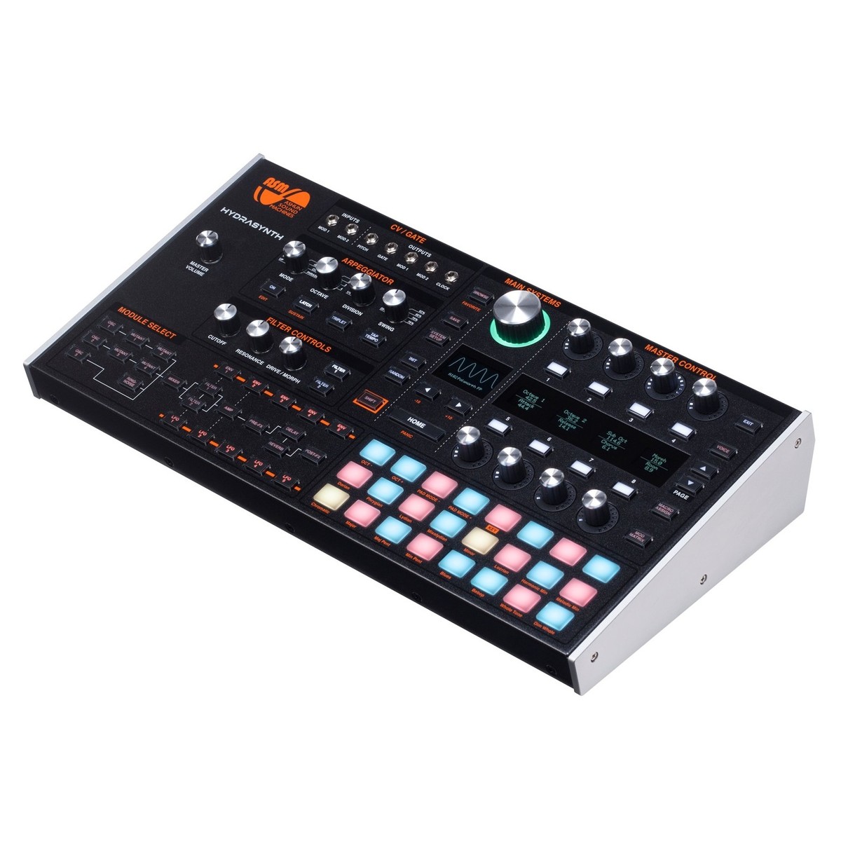 The Hydrasynth Desktop / Rack synthesizer meets all of these needs: place it on your workstation desk or in a nearby rack, and when you want to create a new sound to match your music, you can play the synth from its 24 polyphonic pressure sensitive pads while editing the sound.
