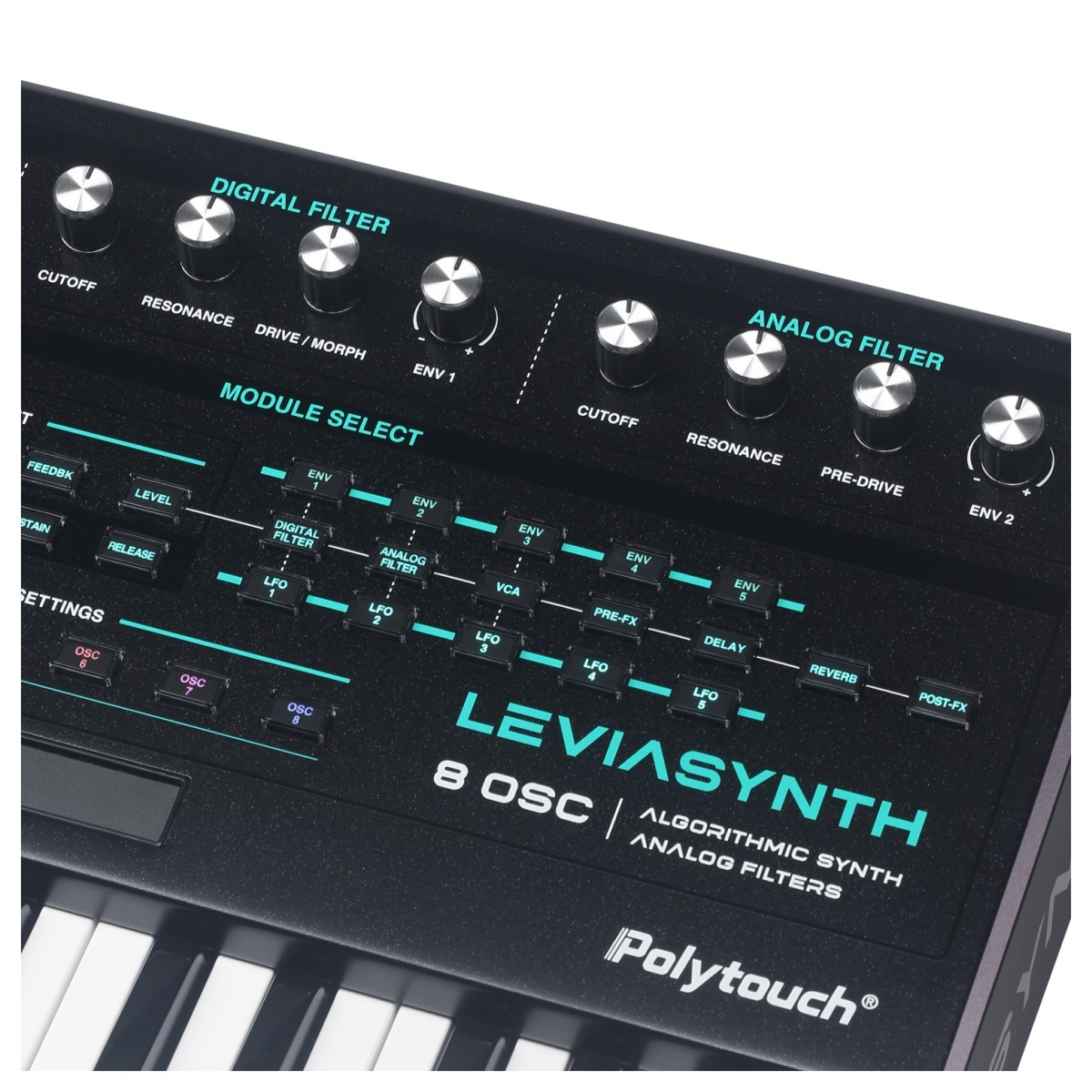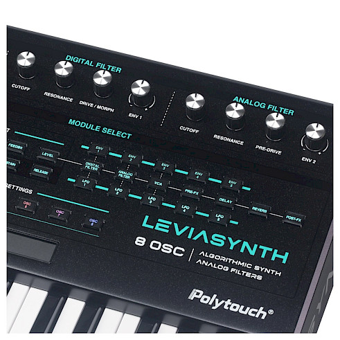 Leviasynth® is a 16-voice, 8-oscillator algorithmic synthesizer with analog filters.