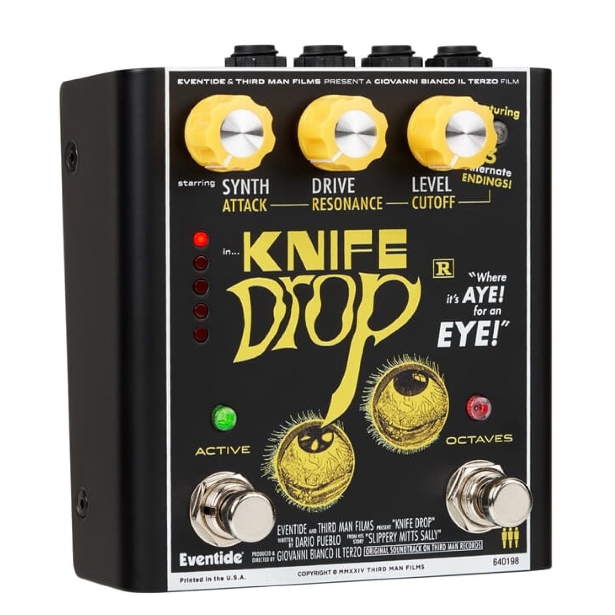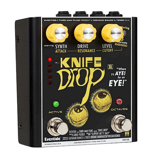 Knife Drop is een suboctaaf fuzz met analoge synth-effectpedaal, mede ontworpen door de verwrongen geesten van Eventide Audio, Third Man Hardware en Jack White. Knife Drop mengt suboctaaf fuzz met een monofone synth, waardoor je riffs een sinister randje krijgen. Ideaal voor het genereren van tonen die chillen en opwinden, levert het viscerale, spookachtige vervorming perfect voor muzikanten die hun geluid tot het uiterste durven drijven.