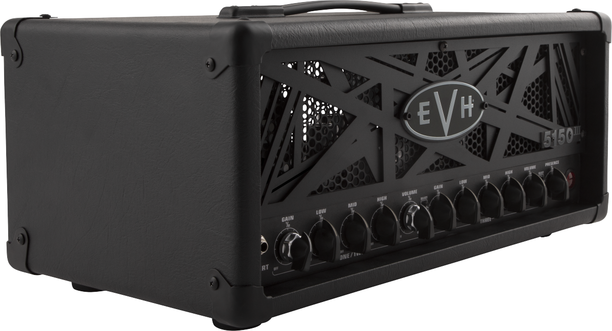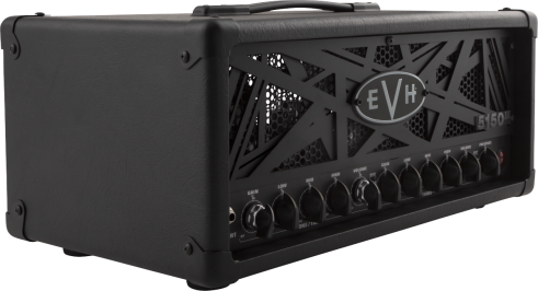 Seductively dark in black textured vinyl with a dual black EVH striped steel grille front panel, our 50-watt stealth head also comes with vintage-style "chicken head" black control knobs, red lamp jewel, dual speaker output jacks, four-button footswitch, effects loop, direct out and molded plastic handle.