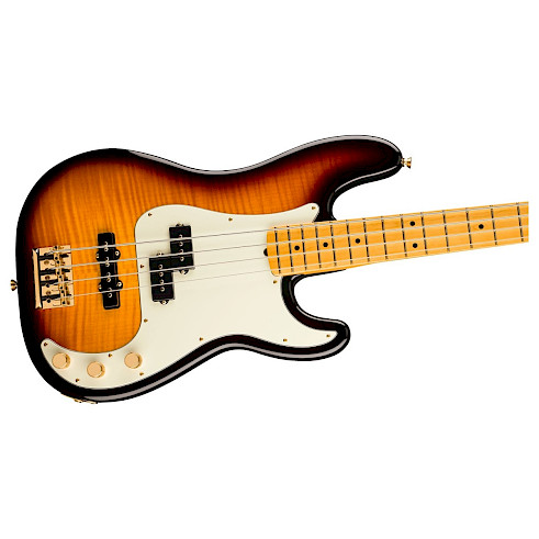 Celebrate 75 years of bass innovation with the 75th Anniversary American Professional PJ Bass. Crafted with a resonant alder body topped with a stunning flame maple top and finished in a classic 2-tone sunburst, this instrument radiates premium elegance. The ‘63 P Bass profile neck now sports smooth rolled fingerboard edges with a comfortable 9.5” radius and medium jumbo frets, a “Super-Natural” satin finish and a newly sculpted neck heel for a supremely comfortable feel and easy access to the upper register. The 75th Anniversary Precision Bass® and Jazz Bass® pickups deliver the best of both worlds - that foundational P-Bass thump combined with the articulate growl and versatility of a J-Bass bridge pickup. Other premium appointments include gold-plated hardware throughout, a vintage HiMass™ bridge and tapered-shaft tuning machines. This limited-edition model represents the evolution of the Precision Bass legacy, a must-have for collectors and bass enthusiasts seeking modern performance.