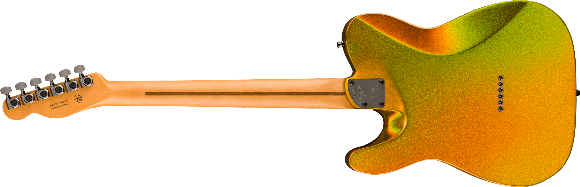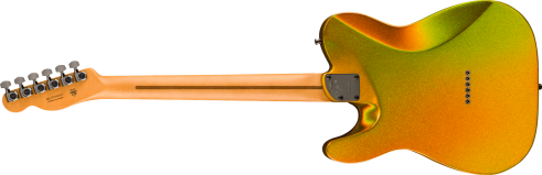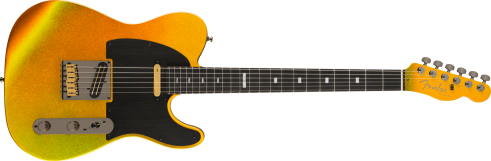 This anniversary Telecaster is dressed up with an incredible Liquid Gold finish that features deep metallic flake which reflects light with a dazzling prism-like glow. All of the hardware is finished in a classy black chrome which is accented by gold appointments on the bridge and pickups for a modern sophisticated look.