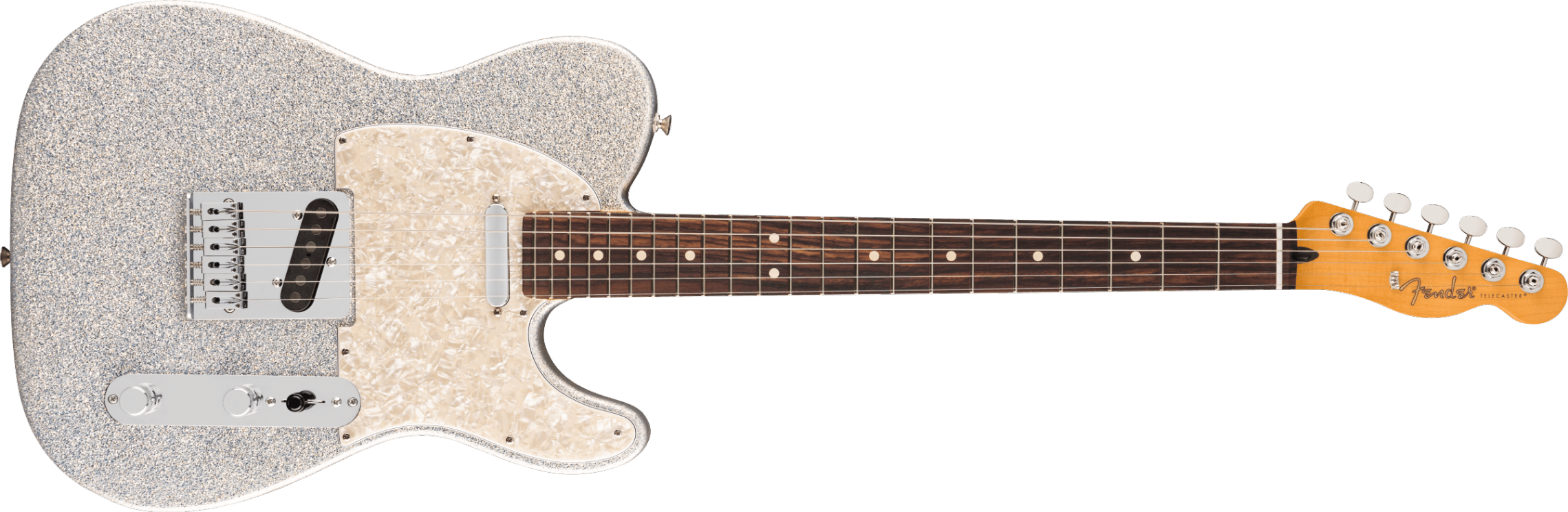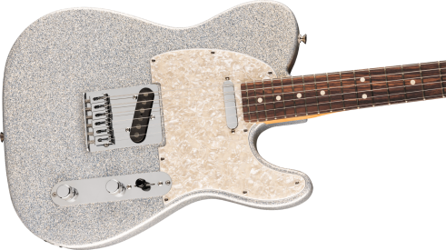 Experience modern craftsmanship with a touch of sparkle in the Player II Telecaster. Crafted with a resonant alder body finished in eye-catching Diamond Dust Sparkle, this instrument delivers both style and substance. The Modern "C" shaped maple neck with 9.5" radius rosewood fingerboard, rolled edges, and medium jumbo frets provide the smooth, comfortable playability that today's players crave. The 75th Anniversary Thunderbolt™ Telecaster® pickups deliver rich, powerful tones with enhanced clarity and punch. Other quality appointments include a 6-Saddle String-Through-Body Bridge with block steel saddles, ClassicGear™ tuning machines and a 4-ply pearloid pickguard with chrome hardware throughout. This exceptional model combines the classic Telecaster foundation with contemporary appointments and premium sparkle finish, perfect for players who want to stand out while delivering that legendary Tele sound.