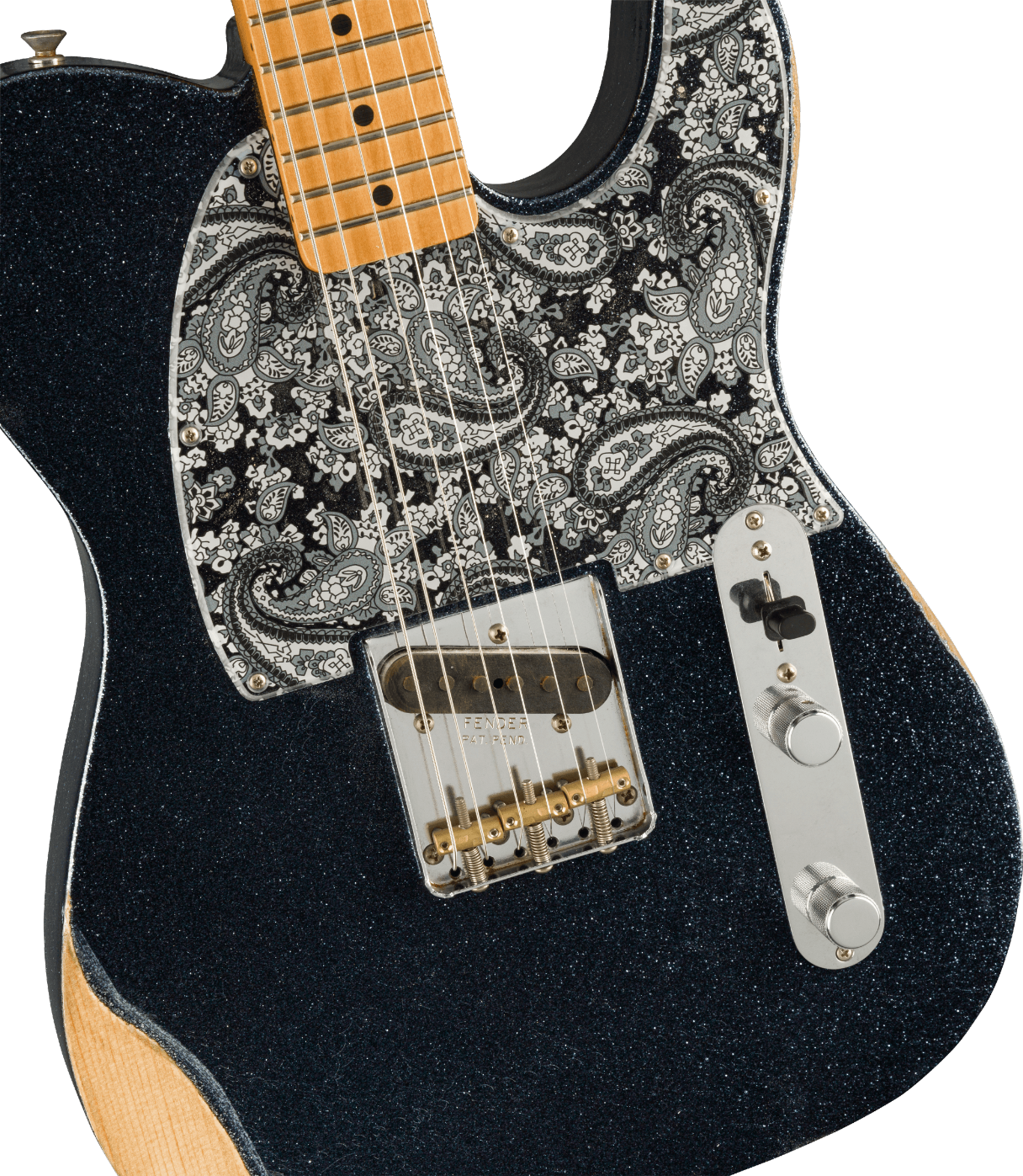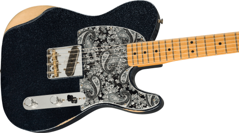 A classy black and silver paisley pickguard complements the Road Worn Black Sparkle finish.