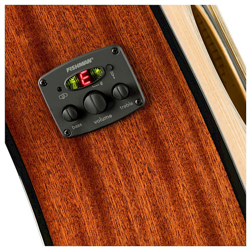 A Fishman pickup/preamp system adds peerless amplified performance with a variety of onboard controls to your acoustic instrument without compromising its pure, rich and resonant tone. The built-in tuner is conveniently placed right where you can see it, making it easy to keep your intonation right on the money.