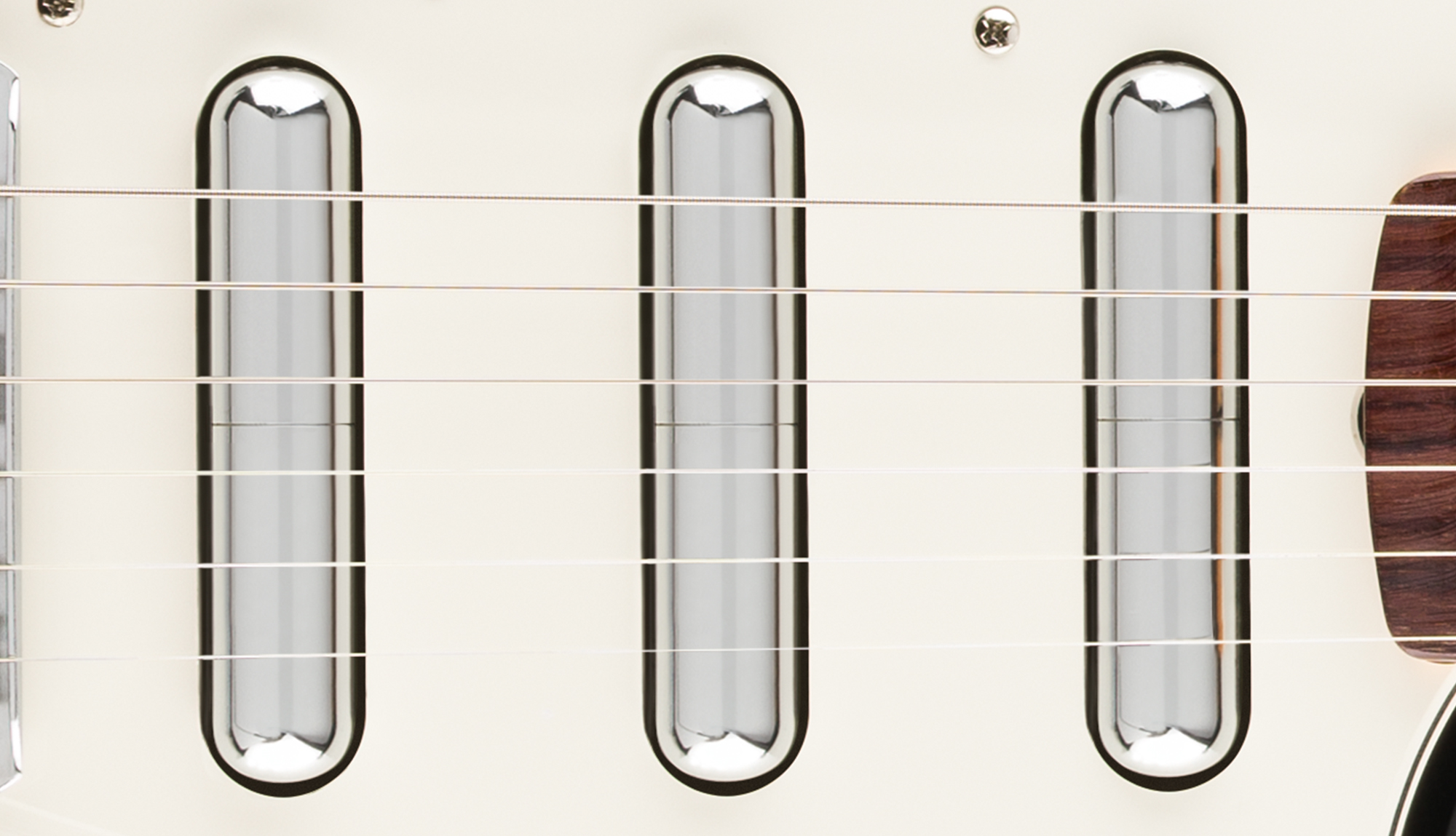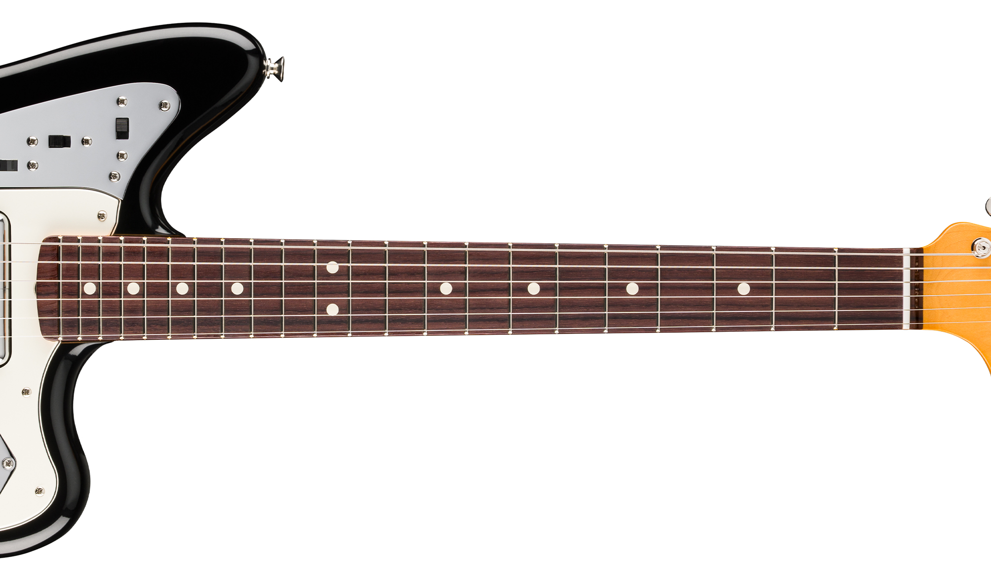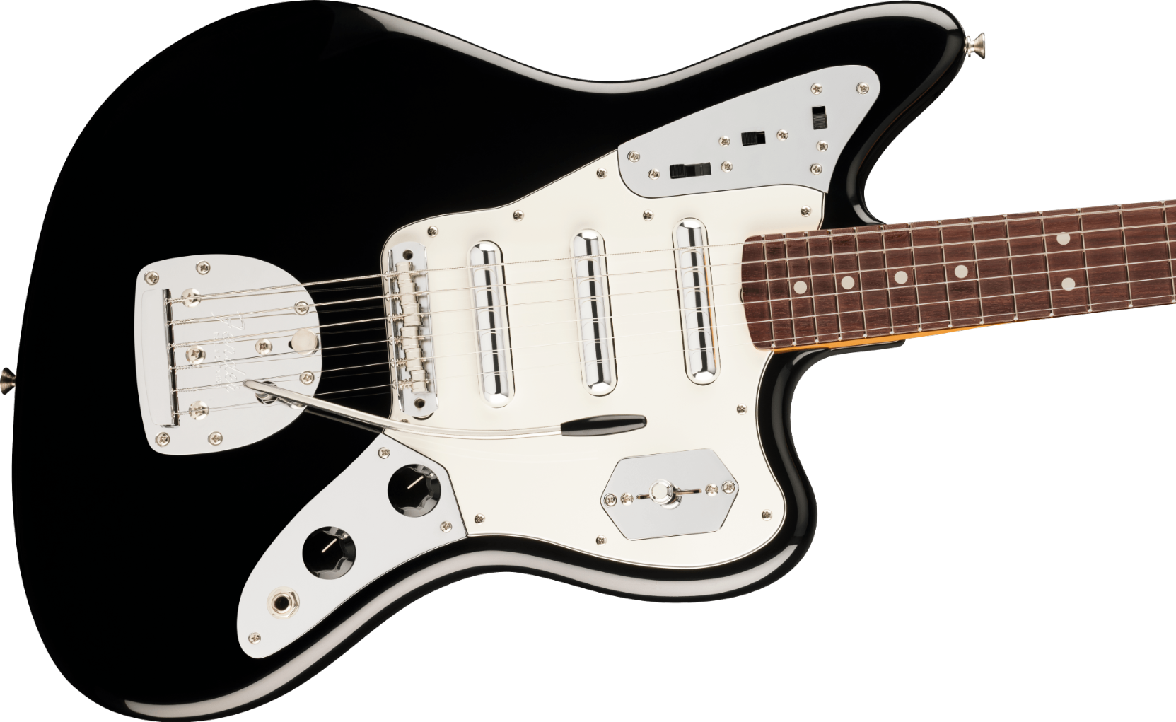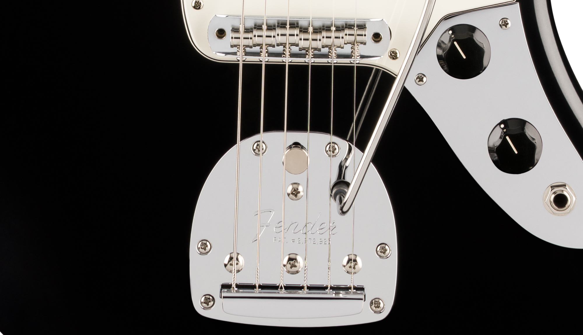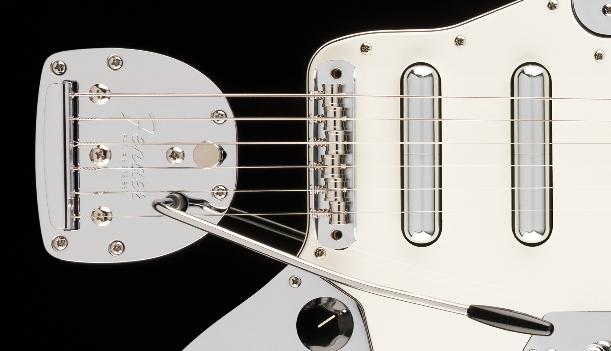 The Jaguar® bridge combines classic design with Mustang® saddles and specialized nylon post inserts for exceptional tuning stability and precise intonation. Protected by a chrome cover, this refined bridge system delivers both improved performance and traditional aesthetics.
