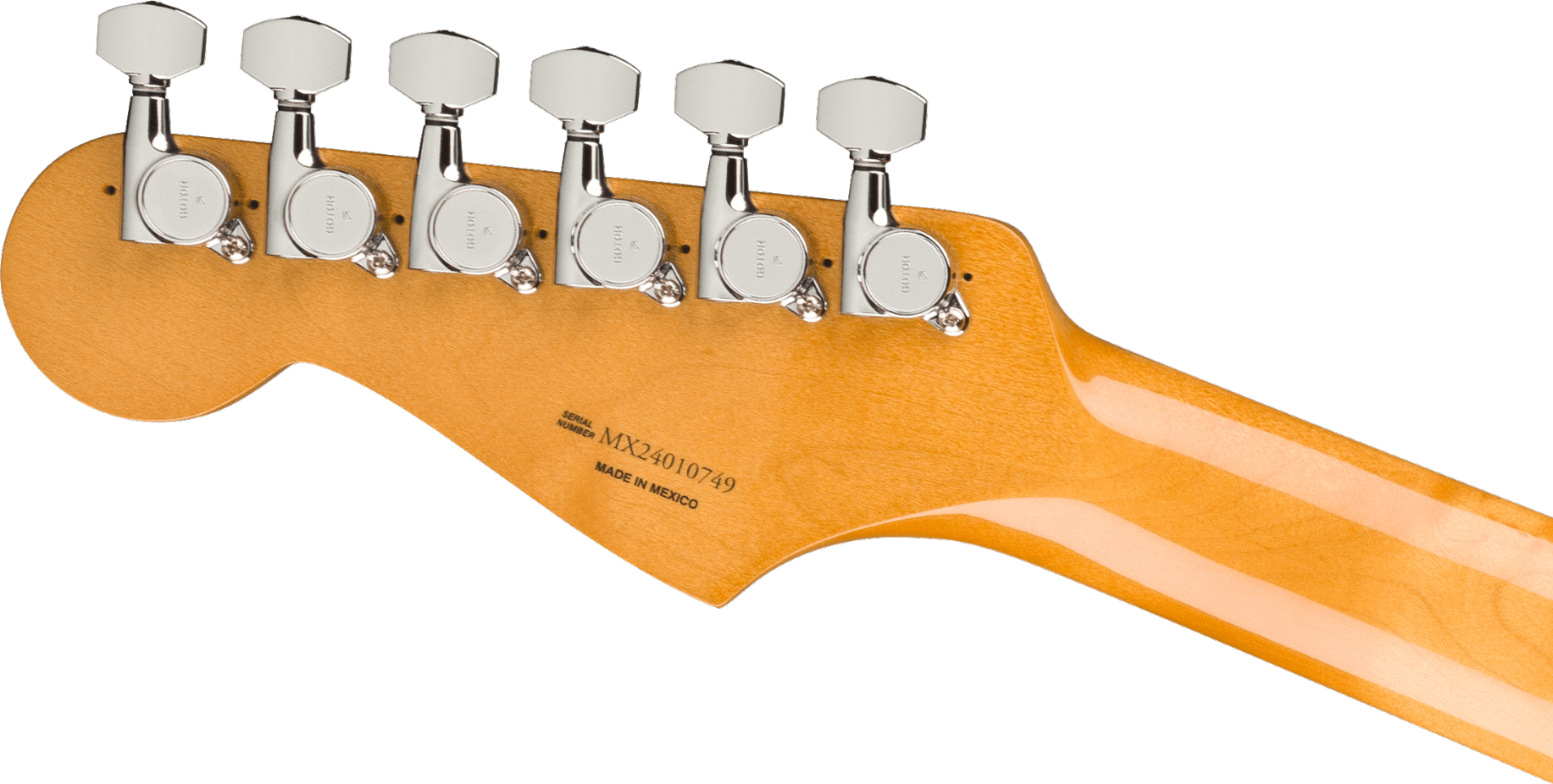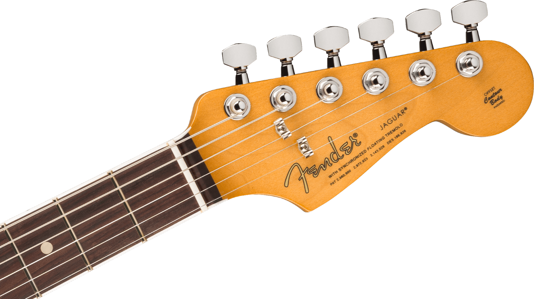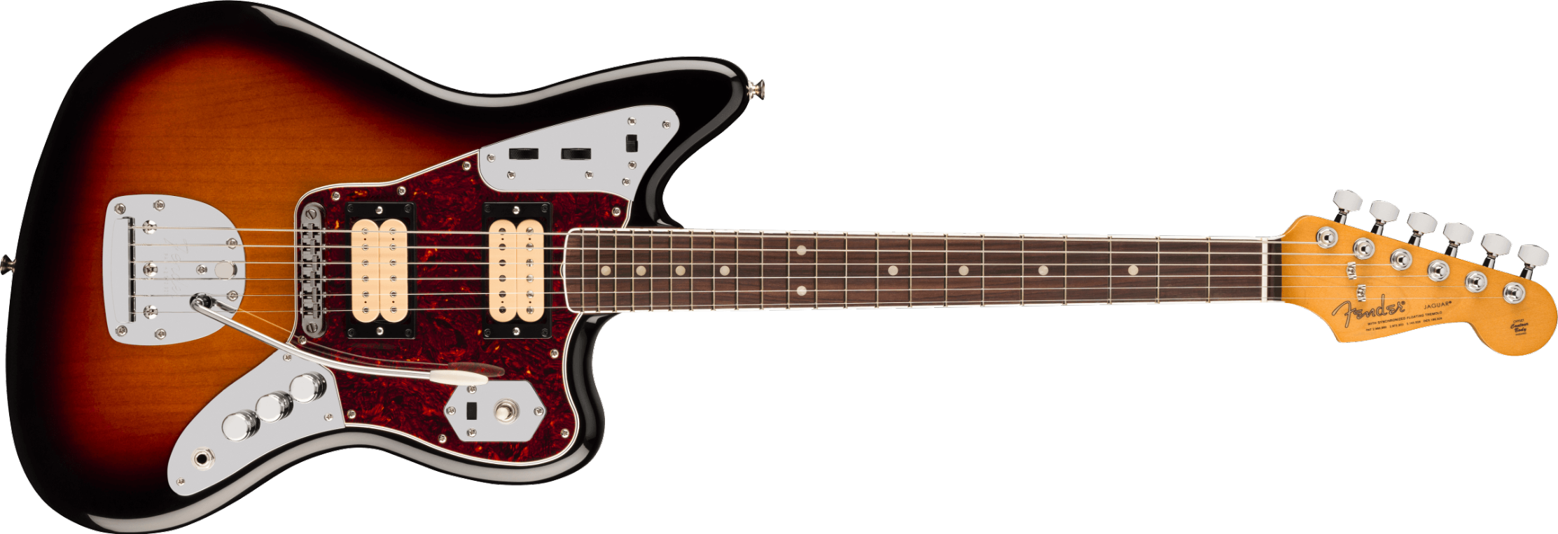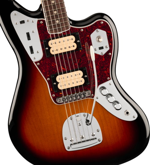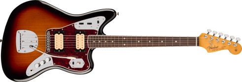 Kurt Cobain’s signature Jaguar model comes with the authentic mid-’60s touch of a rosewood fingerboard with elegant white binding.