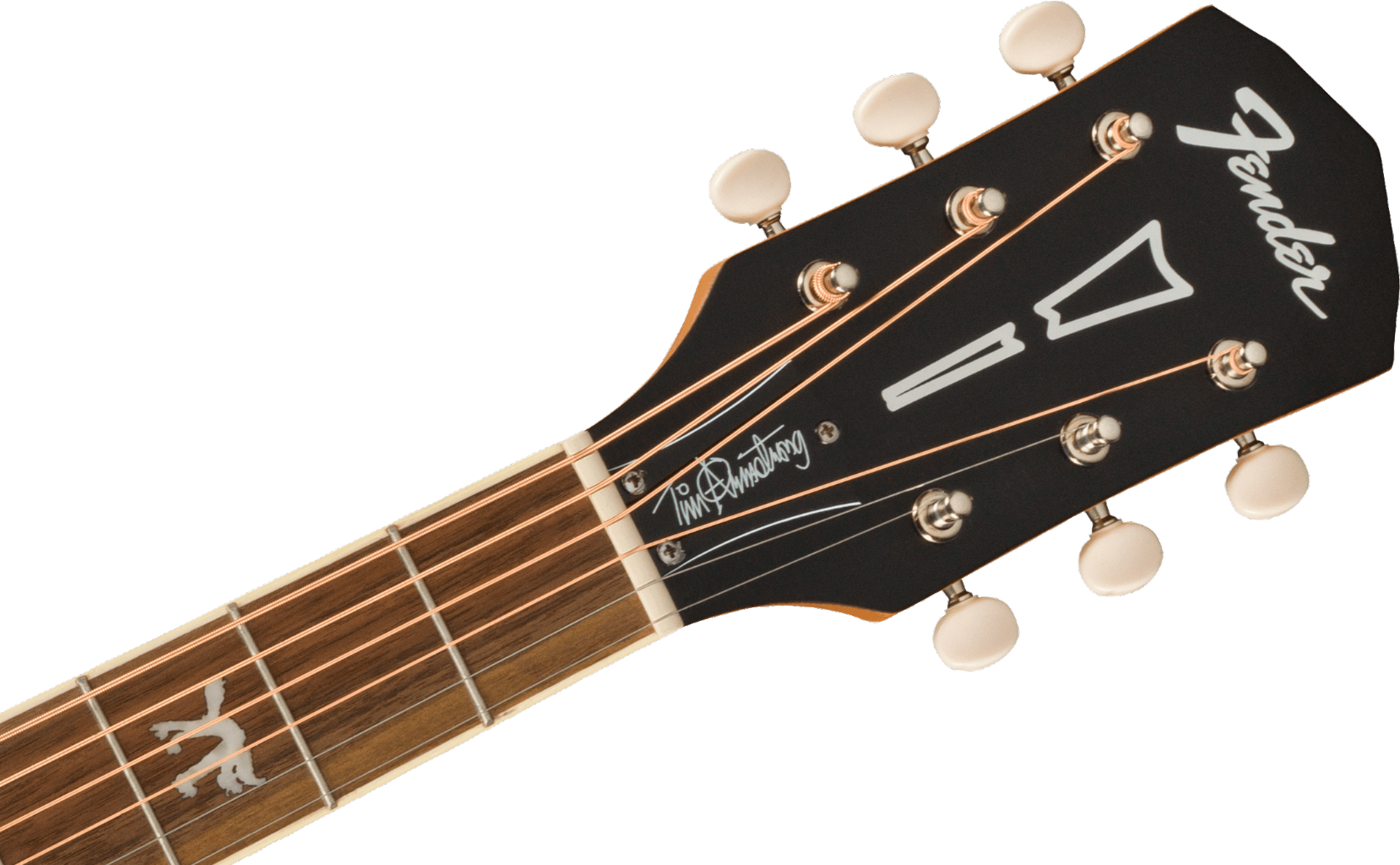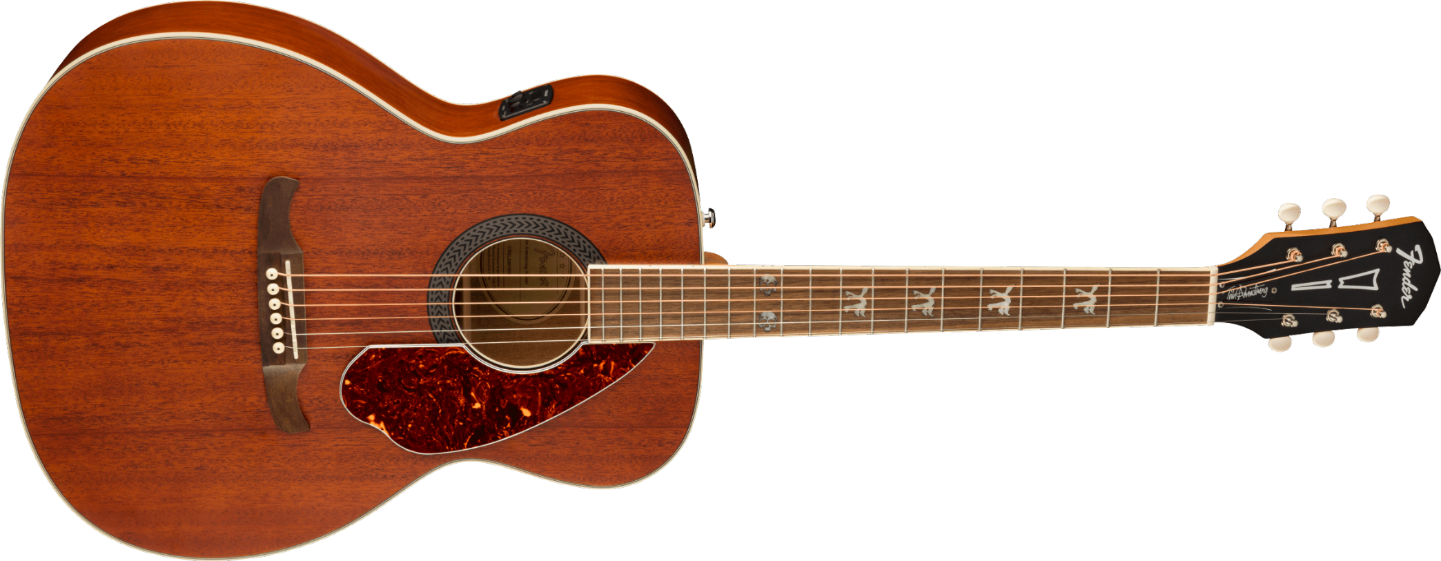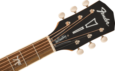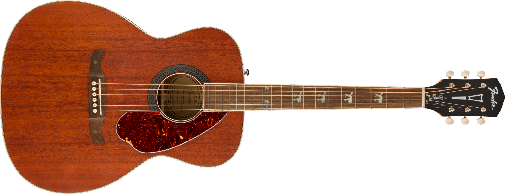 Based on Tim Armstrong's beat-up old '60s Fender® acoustic - on which he writes all of the songs for his legendary punk band, Rancid - the Tim Armstrong Hellcat acoustic is ready to slam. Armstrong has given his acoustic some modern mojo with pearl acrylic "Hellcat" logos on the third, fifth and seventh frets, with a pair of skulls adorning the twelfth fret. Other features include a solid mahogany top, scalloped bracing and Fishman® CD Acoustic preamp.