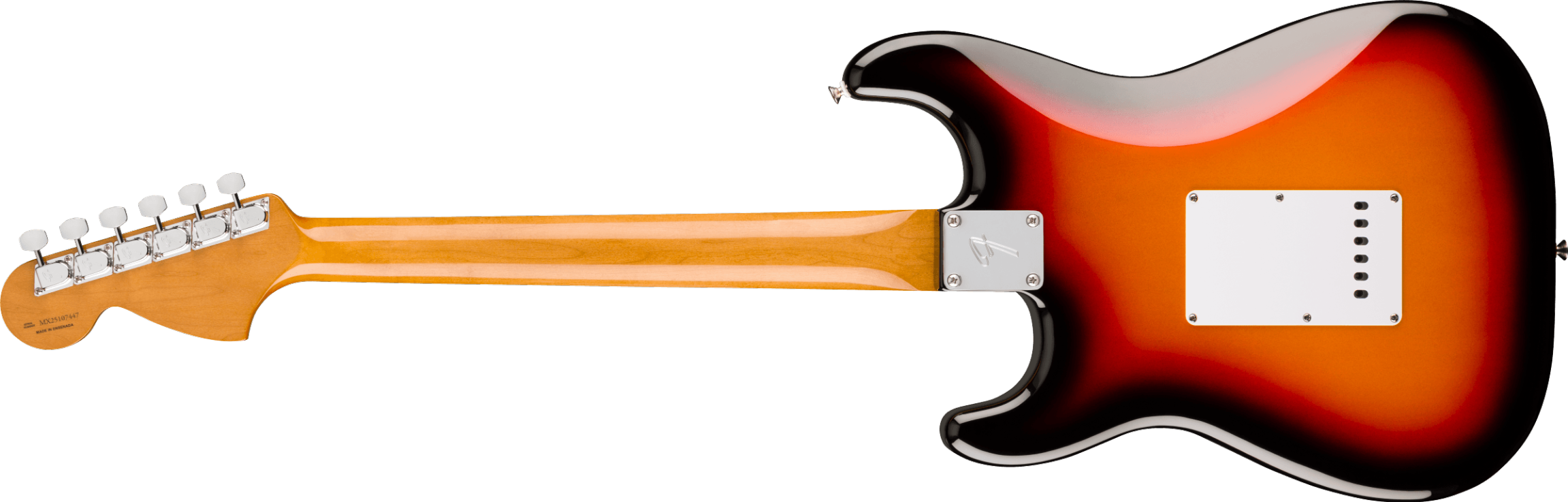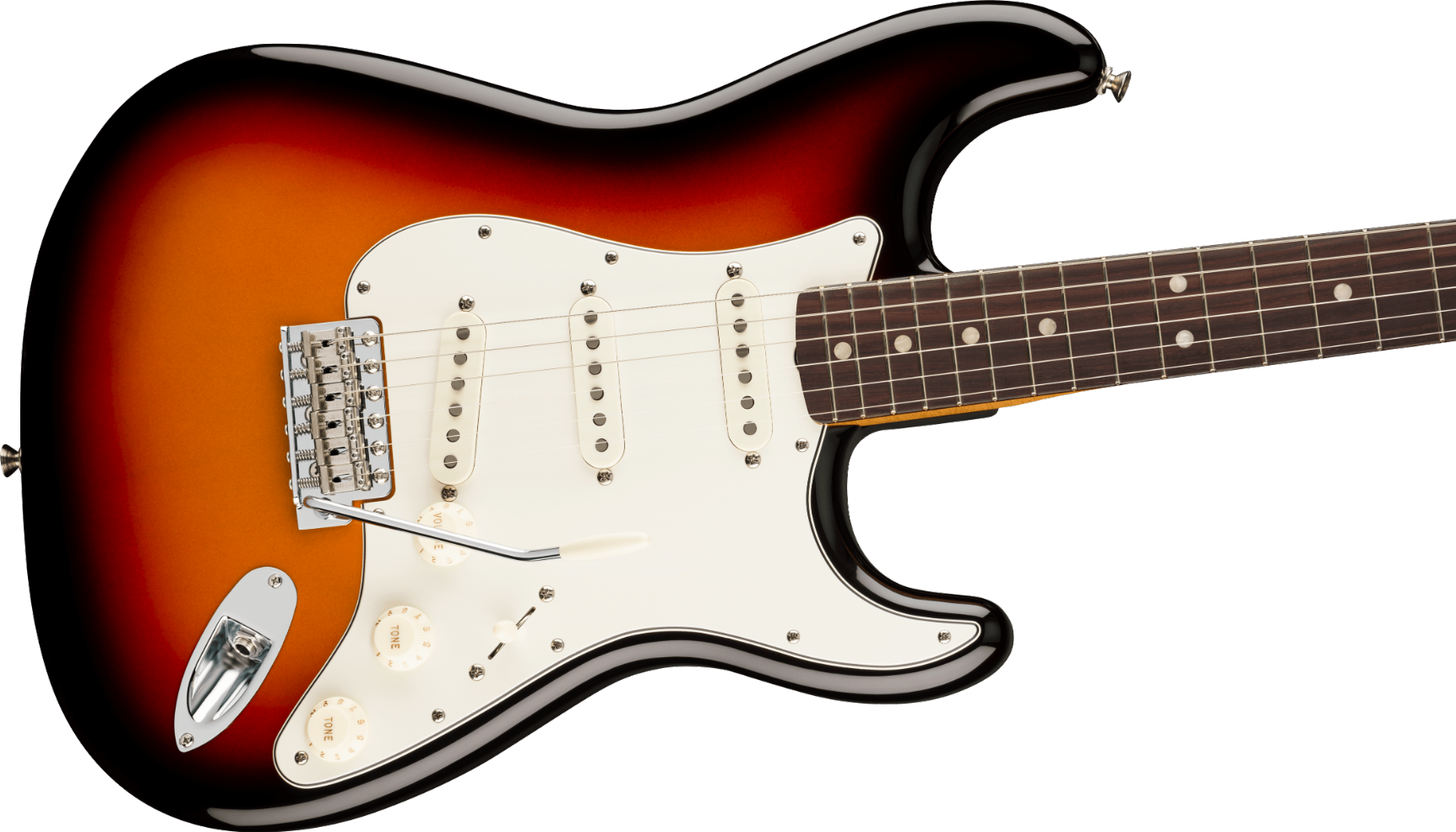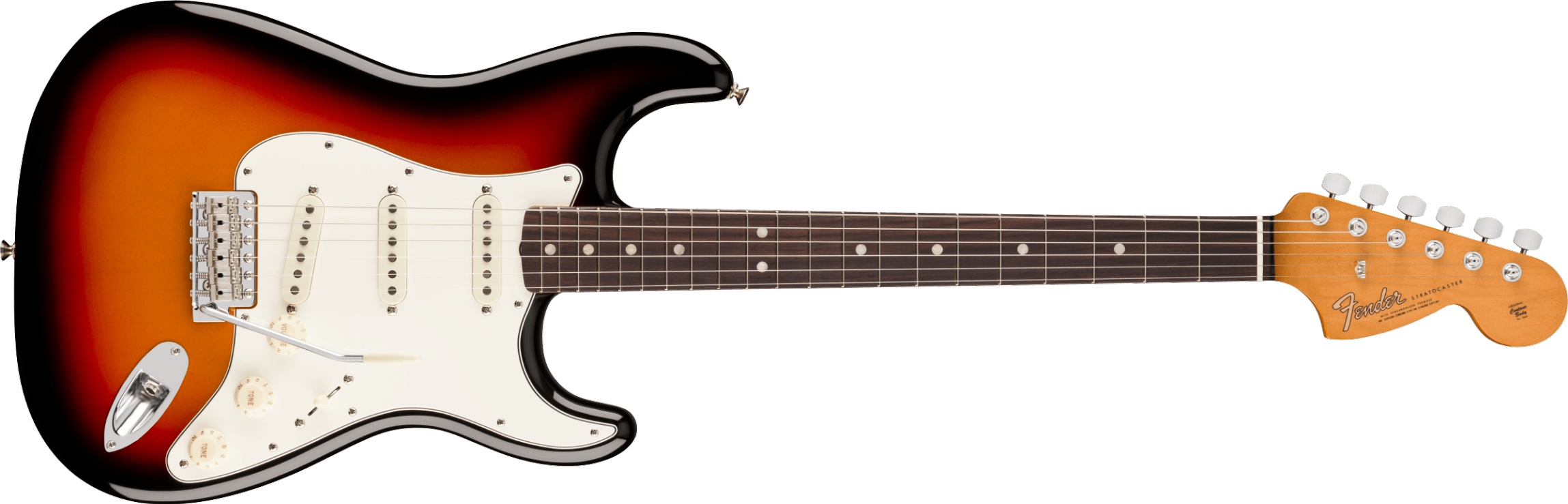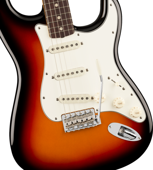 The Vintera® III Late '60s Stratocaster® features an alder body and maple neck with Maple or Rosewood fingerboard and period-correct big headstock, delivering that unmistakable Fender look and sound brimming with punch and crystal-clear articulation. The authentic late '60s “C”-shaped neck profile offers an instantly familiar playing experience that feels natural in your hands, while the 7.25" radius fingerboard with vintage-tall frets ensures supreme comfort and outstanding feel. At its heart, three meticulously crafted vintage-style late '60s single-coil pickups capture the dynamic, versatile tones that established Fender's reputation during this transformative era. The vintage-style synchronized tremolo system provides effortless pitch manipulation, while period-correct vintage-style tuning machines deliver authentic looks with superior tuning precision.