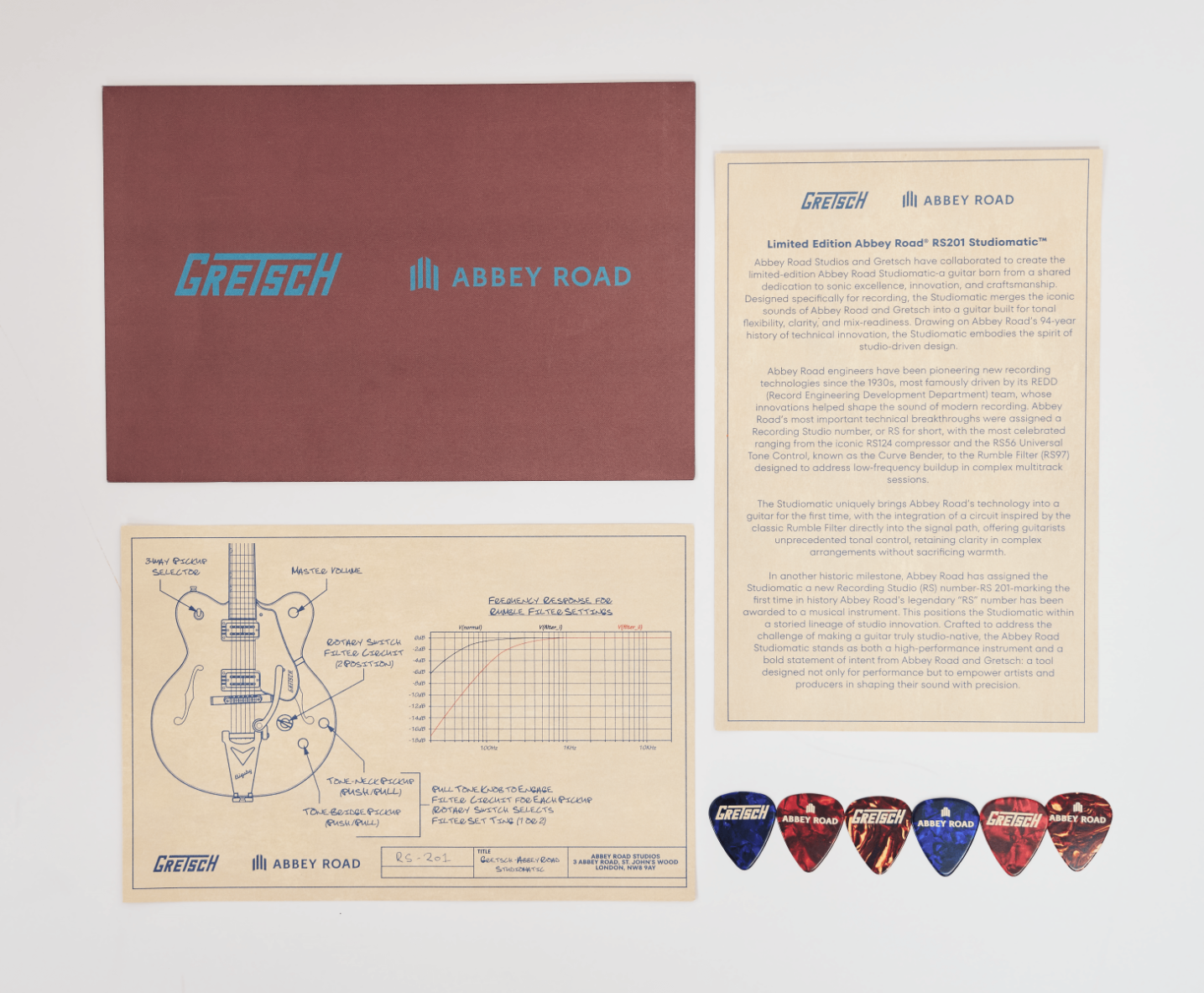 Gretsch is proud to partner with Abbey Road on the development and release of a very special Limited Edition guitar – the Gretsch Abbey Road Studiomatic™ Hollow Body. Featuring custom Filter’Tron™ pickups, and a custom-voiced Rumble Filter circuit developed in collaboration with Abbey Road sound engineers, the Abbey Road Studiomatic™ is not only an homage to the continuing legacy of Abbey Road Studios, but also a unique and incredibly versatile guitar.