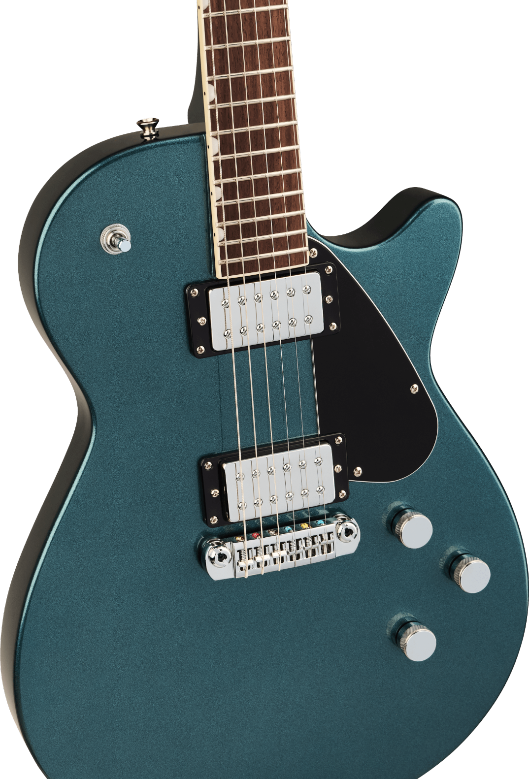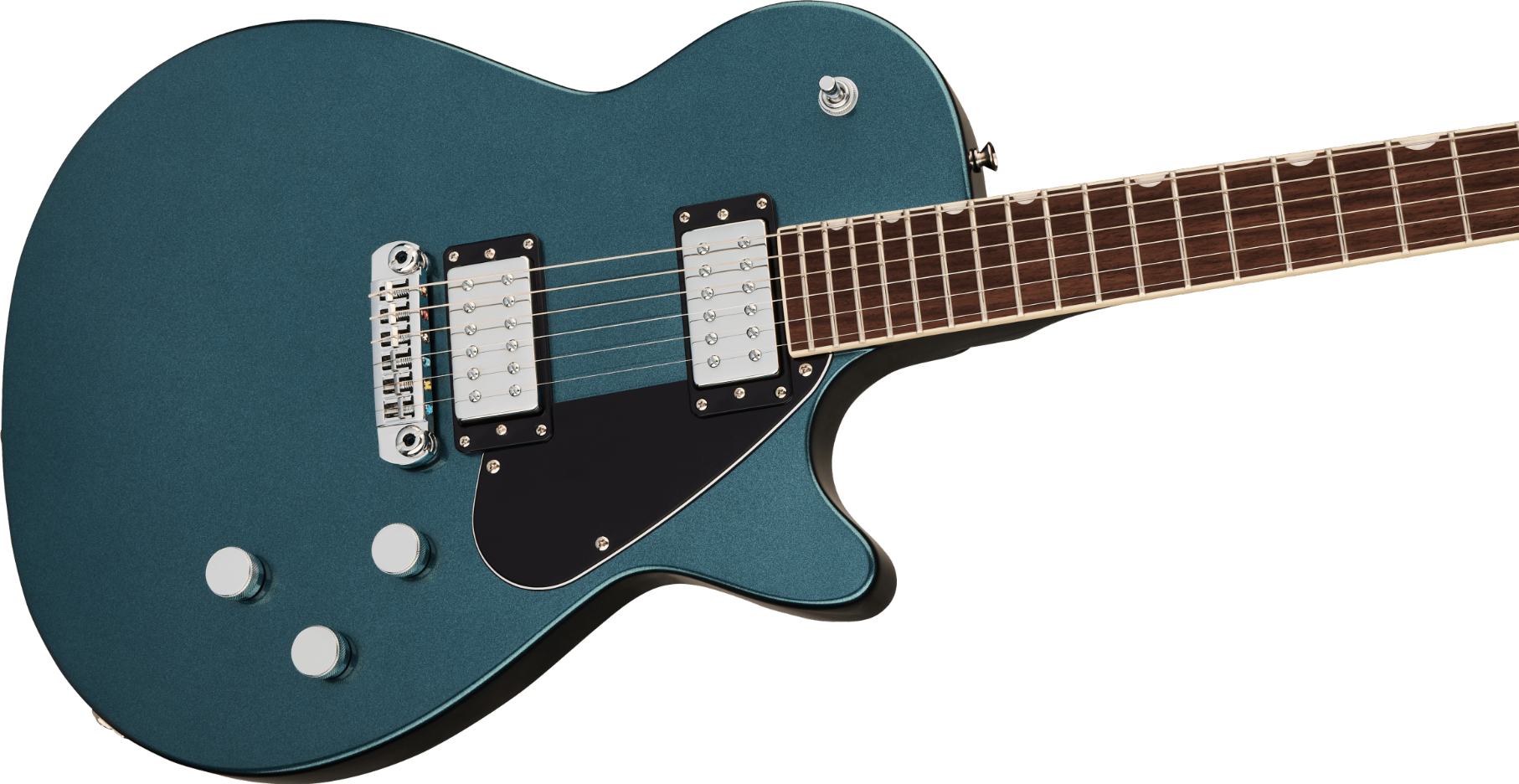 The Electromatic Jet is equipped with a control circuit designed to give you complete tonal control. A master volume with treble bleed circuit provides precise adjustment while maintaining clarity at any volume. Individual pickup tone controls provide intuitive control, calibrated for stellar tone at every setting. Push/Pull tone controls unlock snappy and glassy true single-coil timbres for each pickup, and better yet each single coil combines for a hum-cancelling pair in the middle position.