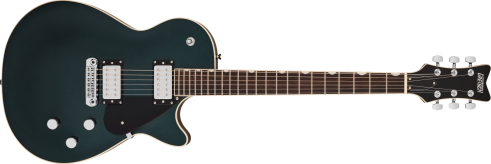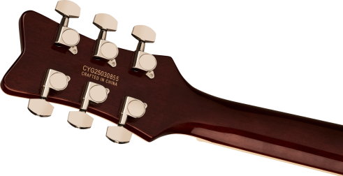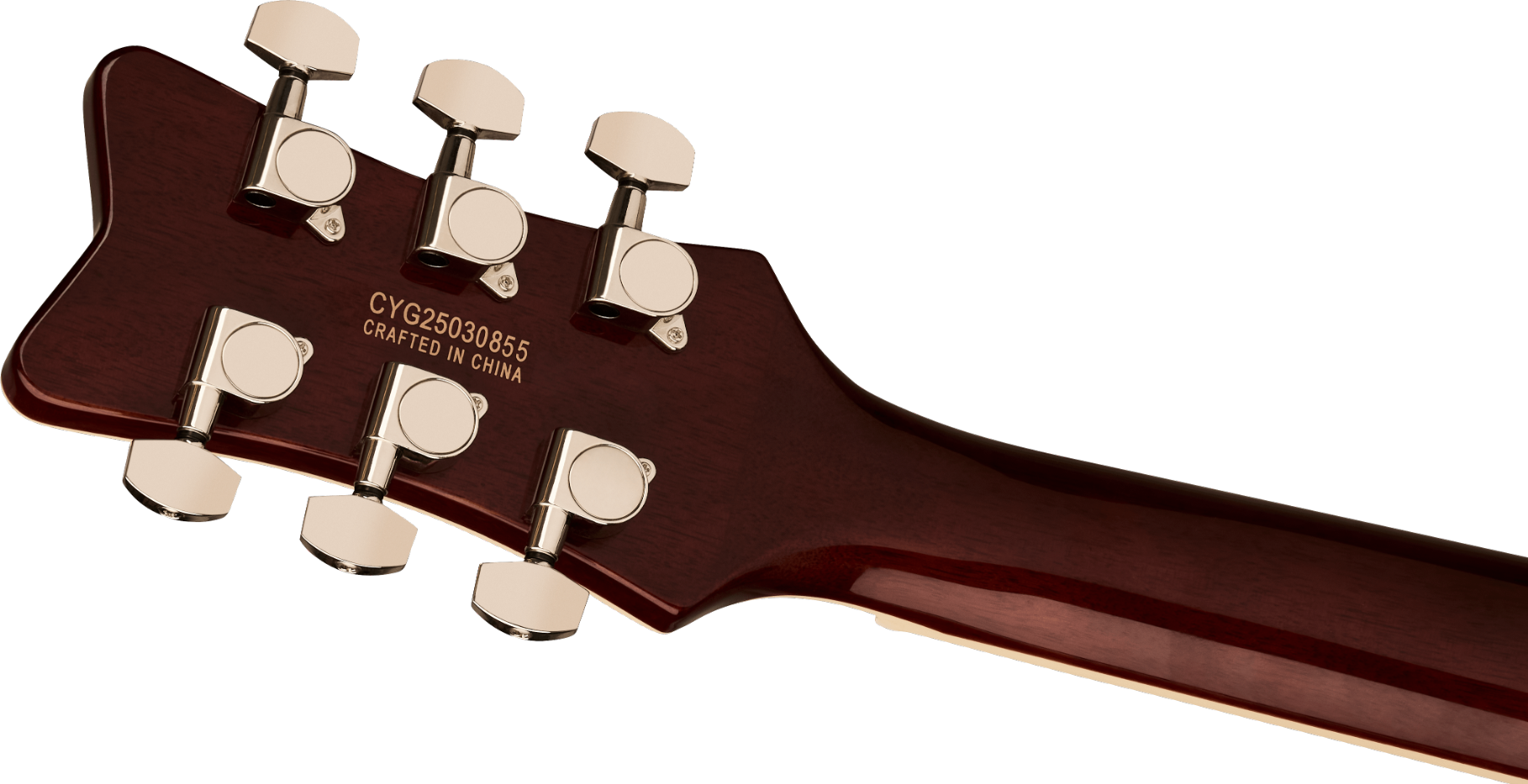 At the heart of each Electromatic Jet is a mahogany body with max core chambering and a carved maple top. Designed for exceptional acoustic balance, this precise combination delivers strong attack with a rich, present mid-range, big lows and shimmering musical highs. A smooth rounded heel allows for unimpeded access to the highest frets, while subtle comfort contours on the body create a balanced ergonomic fit for effortless playability and enhanced comfort.