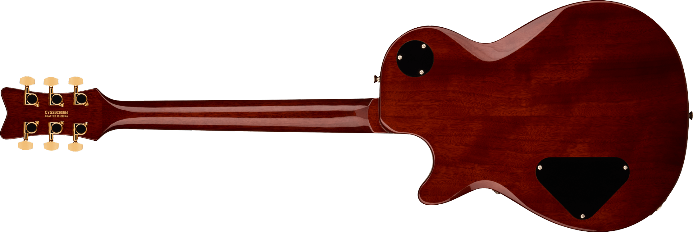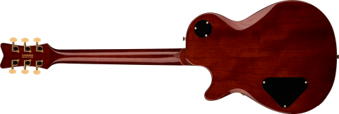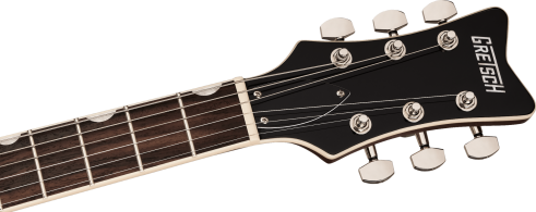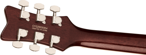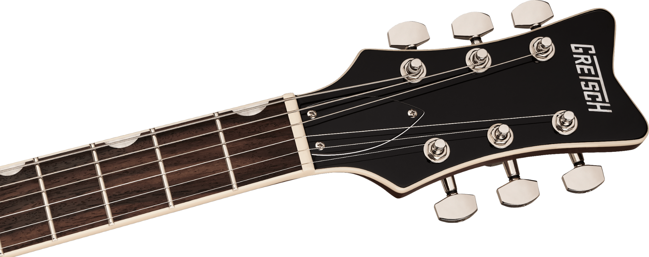 At the heart of each Electromatic Jet is a mahogany body with max core chambering and a carved maple top. Designed for exceptional acoustic balance, this precise combination delivers strong attack with a rich, present mid-range, big lows and shimmering musical highs. A smooth rounded heel allows for unimpeded access to the highest frets, while subtle comfort contours on the body create a balanced ergonomic fit for effortless playability and enhanced comfort.