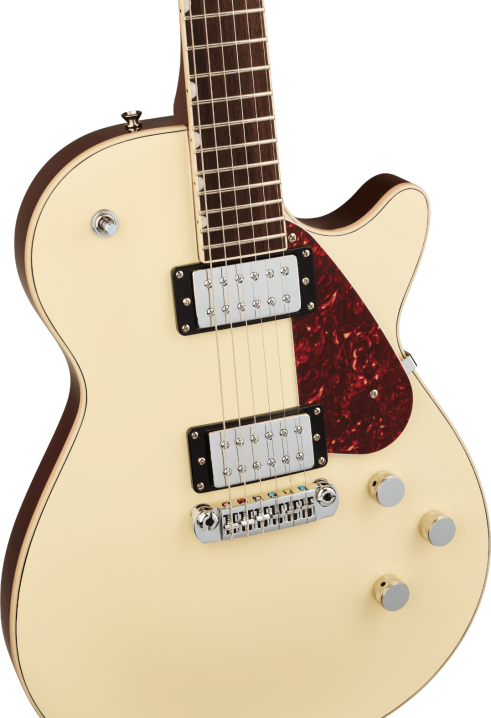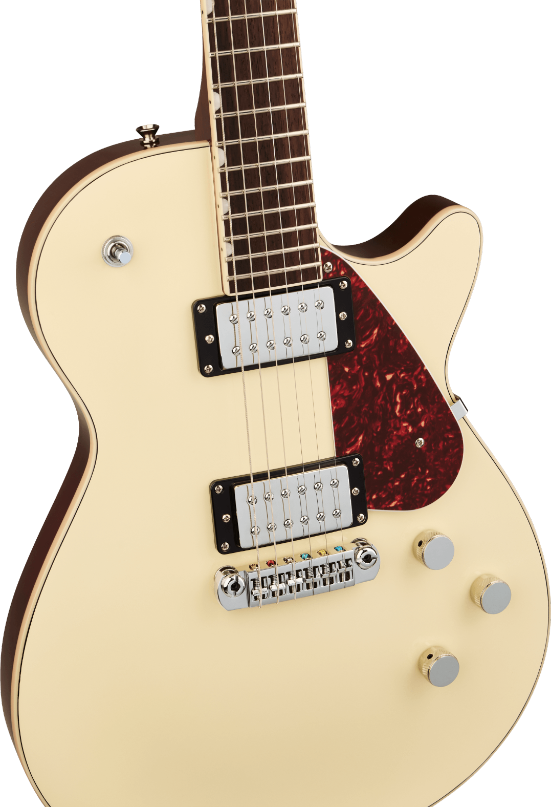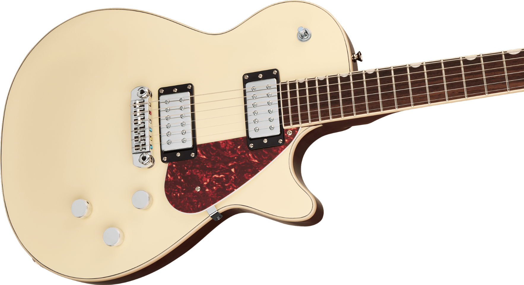 We’ve crafted a balanced, rounded "C" profile with tapered shoulders that is comfortable for all players with just enough mass to ensure precise playability in all positions. Mahogany construction lays a perfect foundation for bold and powerful tone. When it comes to tone and playability, there’s almost nothing more important than an instrument’s fingerboard. Electromatic Jets feature a genuine rosewood fingerboard with 1-ply aged white binding that generates both smooth, silky feel and warm, woody tone.