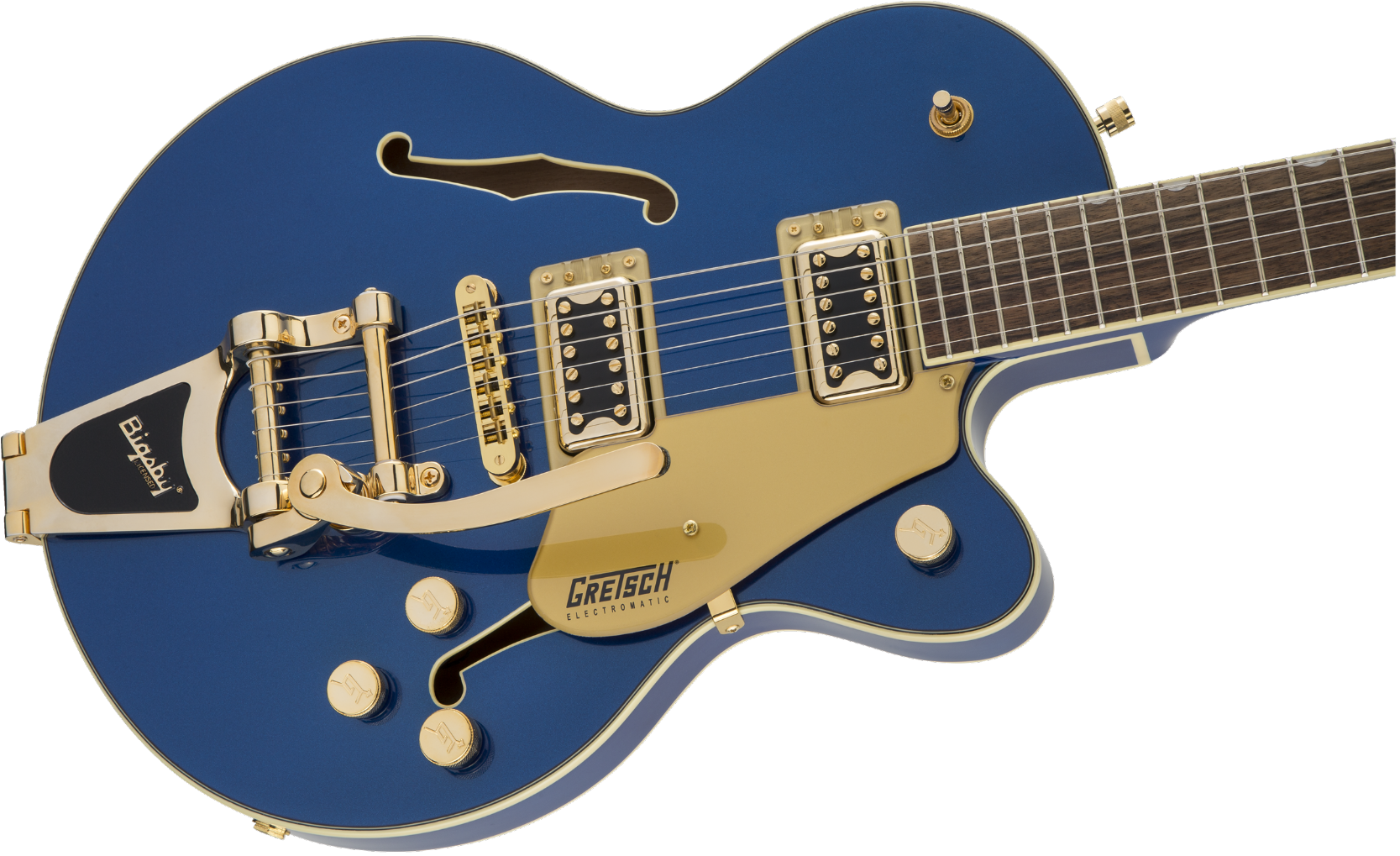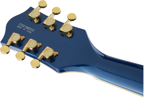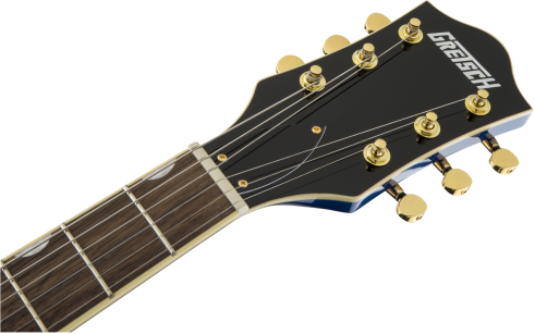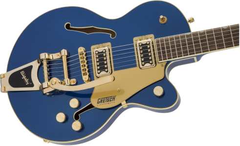 This guitar boasts stage-stealing style with three stunning finishes - Azure Metallic, Cadillac Green and Orange Stain - and gleaming gold hardware, including the Bigsby® B70 vibrato tailpiece, anchored Adjusto-Matic™ bridge and G-arrow knobs.