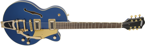The G5655TG Electromatic® Center Block Jr. Single-Cut with Bigsby® and Gold Hardware features a smaller-sized body with a chambered spruce center block for dynamic resonance, high gain power and lightweight comfort.