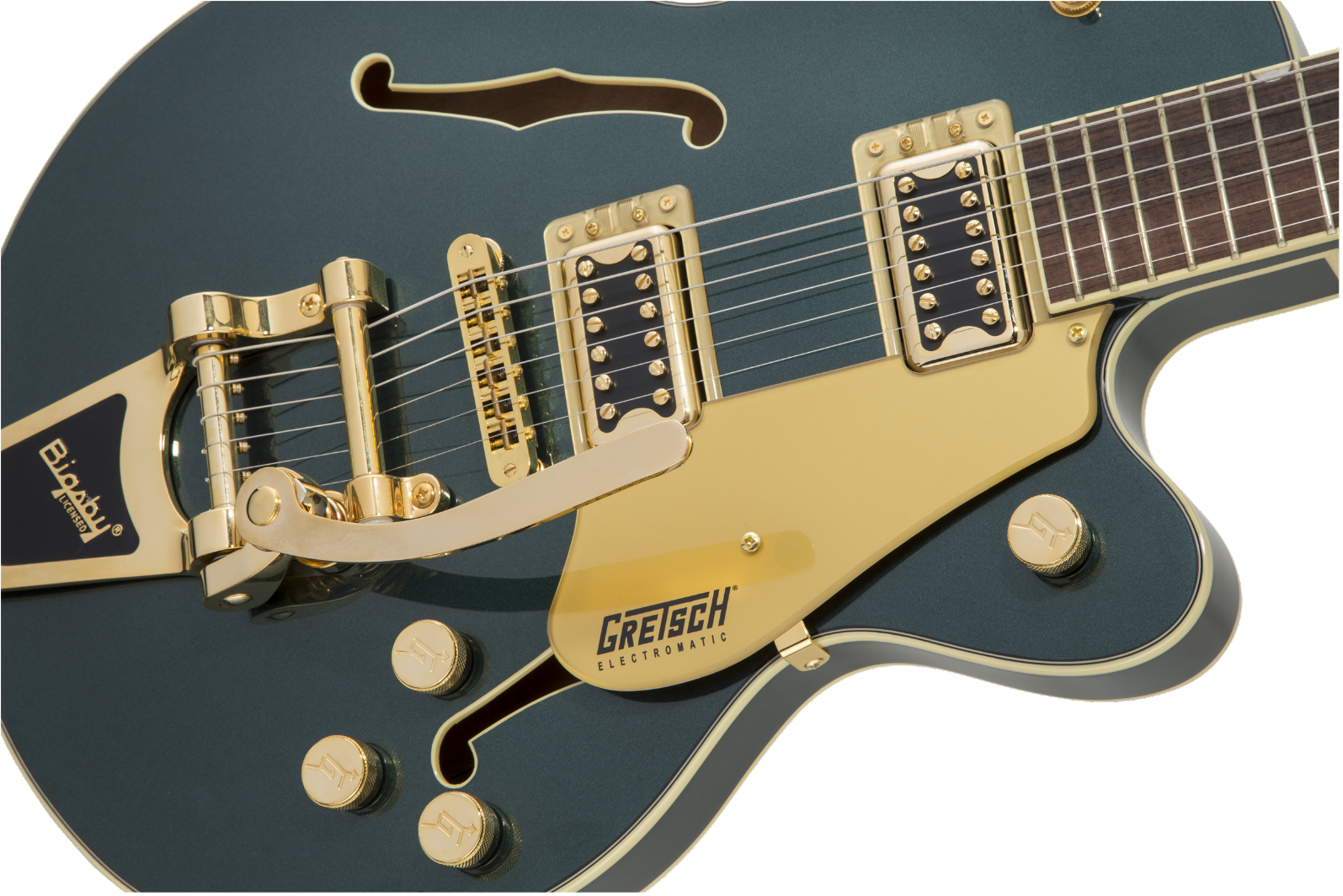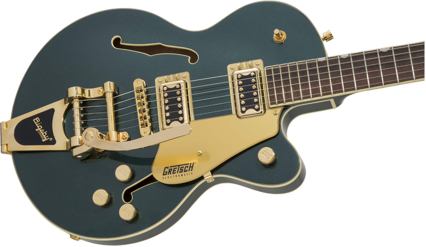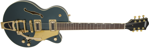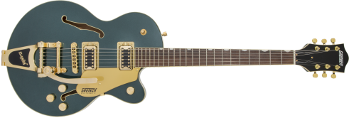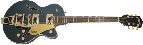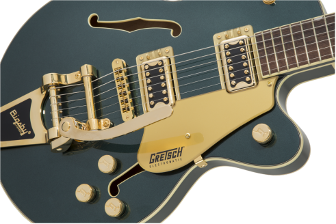 This guitar boasts stage-stealing style with three stunning finishes - Azure Metallic, Cadillac Green and Orange Stain - and gleaming gold hardware, including the Bigsby® B70 vibrato tailpiece, anchored Adjusto-Matic™ bridge and G-arrow knobs.