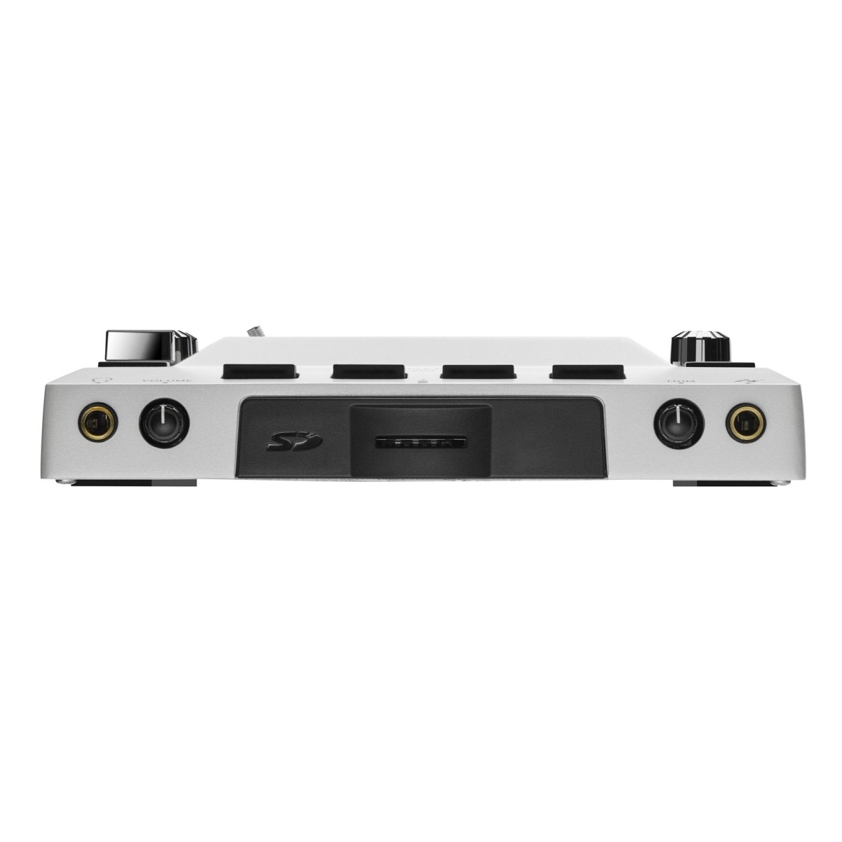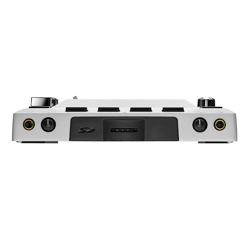 Ook qua aansluitingen laat de KAOSS PAD V niets te wensen over, want naast de LINE-in- en uitgangen en de afzonderlijk regelbare hoofdtelefoonuitgang is er ook een symmetrische microfooningang beschikbaar, die indien nodig ook als Hi-Z-ingang voor gitaren of elektrische bassen kan worden gebruikt. Dankzij de geïntegreerde USB-audio-interface is het ook mogelijk om audiosignalen rechtstreeks van de computer naar de KAOSS PAD te sturen of je eigen performance binnen een DAW op te nemen. Maar dat is nog niet alles: de KAOSS PAD V biedt uitgebreide samplingfuncties waarmee lopende tracks in realtime kunnen worden gesampled, geloopt en geremixt, waardoor het apparaat de ultieme performance-machine voor op het podium wordt. Hiervoor zijn vier samplebanken beschikbaar, die tegelijkertijd kunnen worden gebruikt.