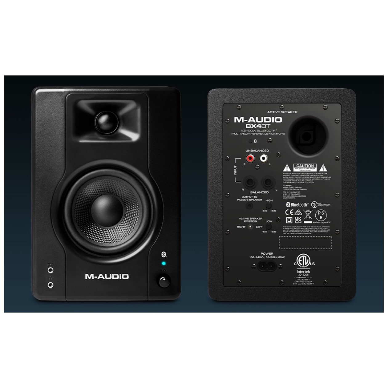 M-Audio's BX4BT monitors produce 120 Watts of professional sound inside a futuristic design that delivers pro-grade sound. The two-way design features an Acoustically-inert MDF cabinet with bass reflex that push low frequencies through modern Black Kevlar® drivers. Plus, enhanced rear ports and computer-optimized natural silk dome tweeters deliver the full spectrum of frequencies needed for any type of media.