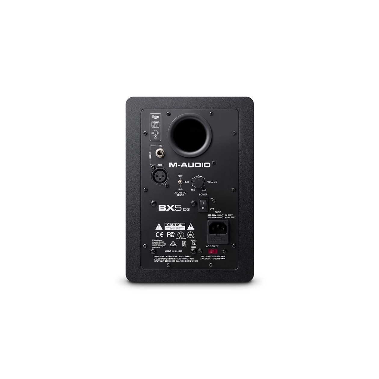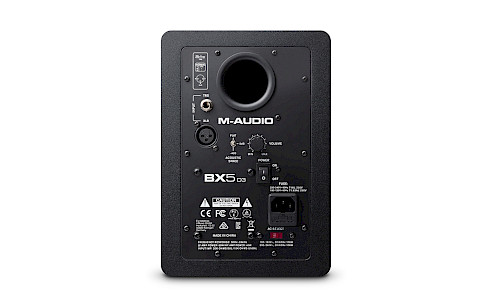 With M-Audio’s BX5-D3, every detail has been meticulously engineered with one goal in mind - to facilitate the freedom to mix with confidence. BX5-D3 monitors have a rear-mounted bass port, meticulously engineered to the exact length and diameter. The result? Deep, defined bass response with maximum bass extension and resolution. When combined with a smoothly-flared port, BX5-D3 monitors markedly reduce the audibly-intrusive air turbulence that results when bass is played back at high sound pressure levels (SPLs). BX5-D3’s tweeter is mounted in a custom waveguide for reliably accurate dispersion that eliminates unwanted high-frequency “scatter,” whilst ensuring a soundstage that remains consistently wide and stable. For seamless setup and easy-location of the optimum listening position, the BX5-D3’s front-mounted positioning LED shines brightly when you’re located in the perfect listening spot, for uncompromisingly accurate and reliable critical evaluations. Finally, BX5-D3’s iconic design on the front panel—M-Audio’s famous “keyhole” shape—is more than just an attractive look: This special “fastenerless” design ensures so there are no driver attachment screw heads to interfere with the sound coming from our drivers.