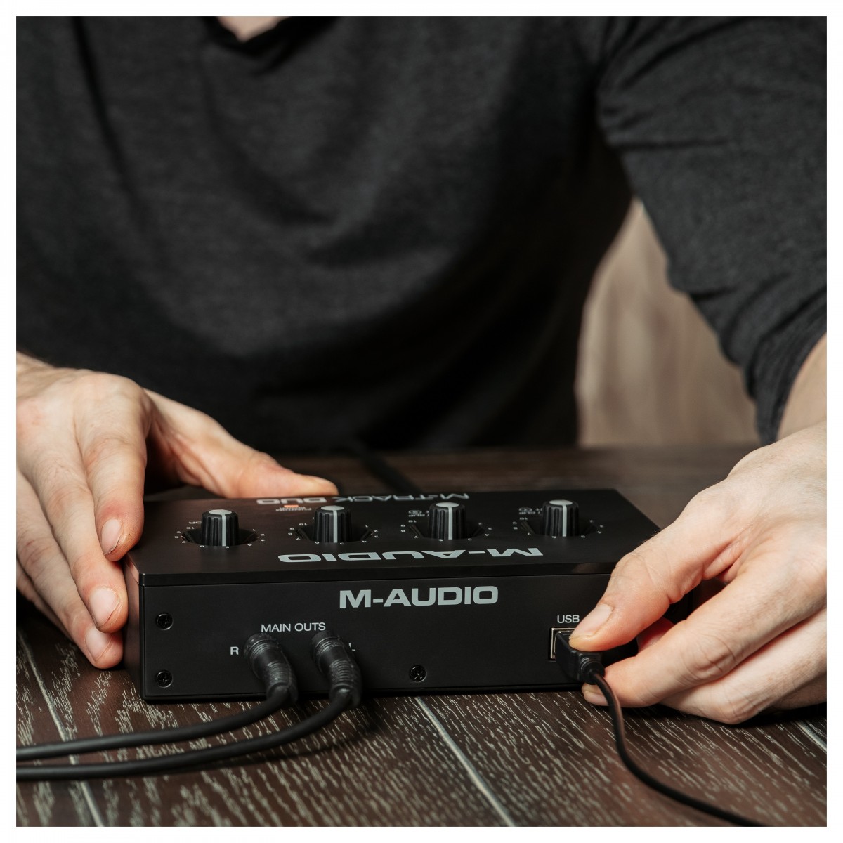 The M-Track Duo is the best, most portable recording interface in its class. It delivers 48 kHz audio resolution in a compact and easy to use format that is ideal for creating music on any Mac, PC or iOS device. This versatile interface works great for recording any type of sound source and features two Combo Crystal Preamps with phantom power, making it compatible with any microphone. Plus, there is a dedicated switch to choose either a line level or instrument level input, perfect for connecting digital pianos, drum machines or any other stereo ¼” inch line level device, as well as the best possible signal for DI guitar or bass. M-track Duo is completely powered by USB, which makes it portable and perfect for anyone on-the-go. Throw it into your bag, grab a laptop, and create your next podcast, song, or mix, anywhere you want!