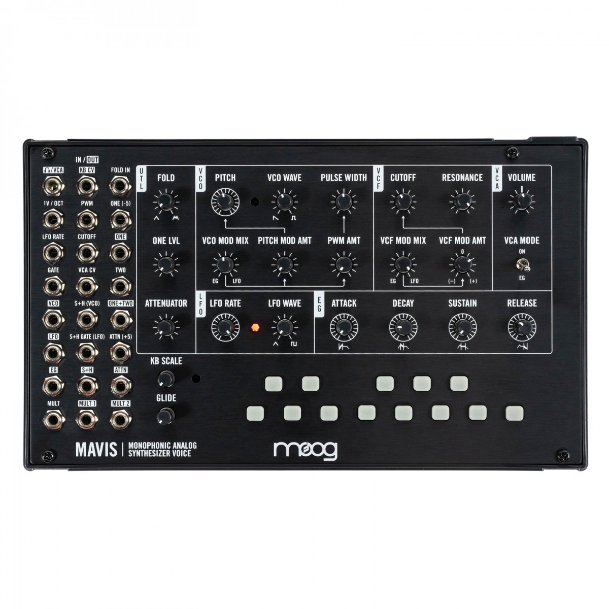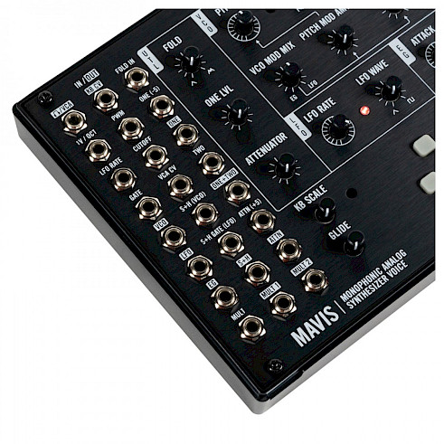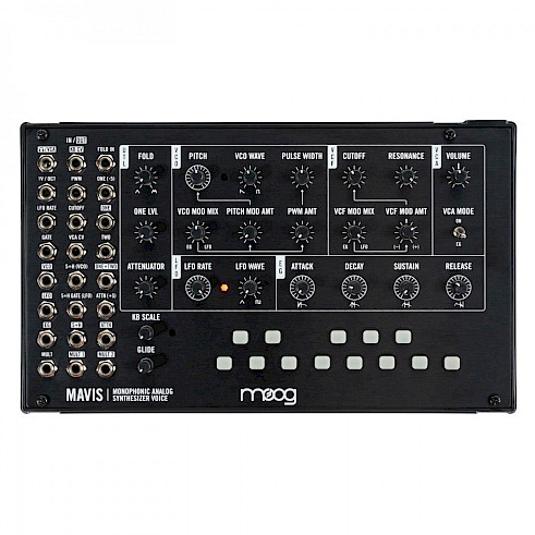 Mavis features Moog’s first-ever wavefolding circuit, allowing for additive synthesis to sit alongside traditional subtractive synthesis, and features a broad modular utilities section complete with attenuators, offsets, mults, and a flexible DC-coupled mixer.
