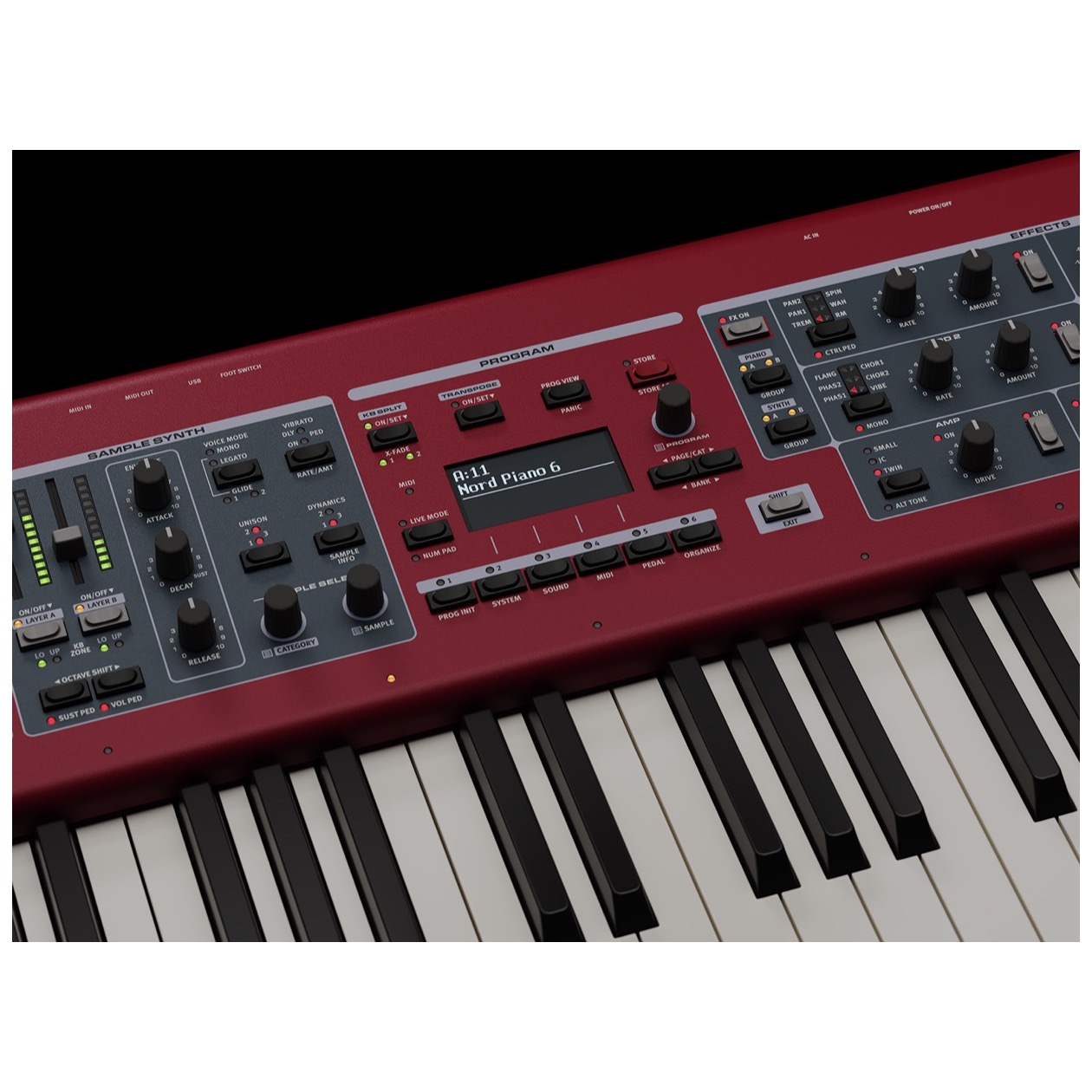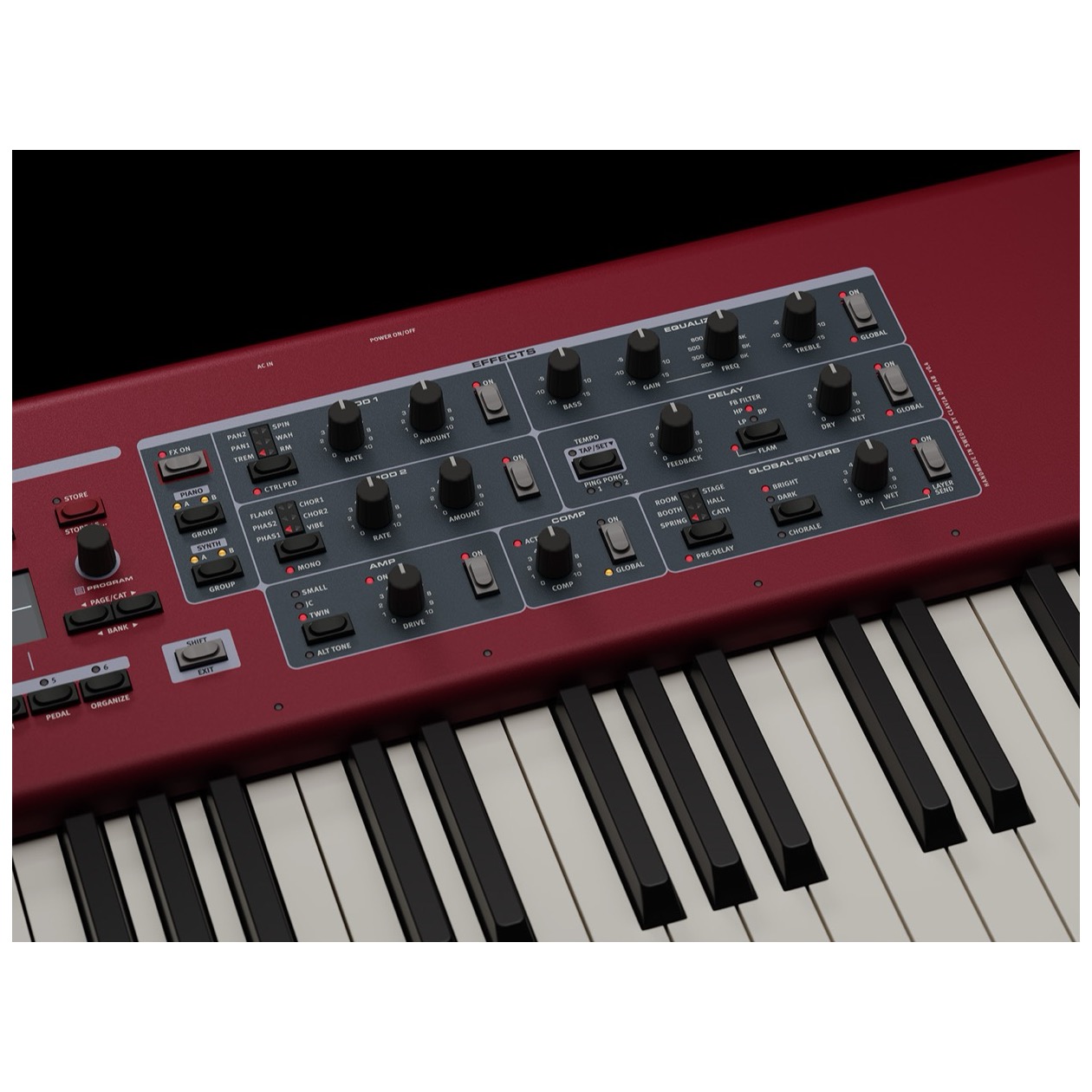 The Nord Piano 6 has an expanded new Effects section per Layer. The wide range of Effects includes brand new types of Reverb, Delay, Amps and Modulation effects.