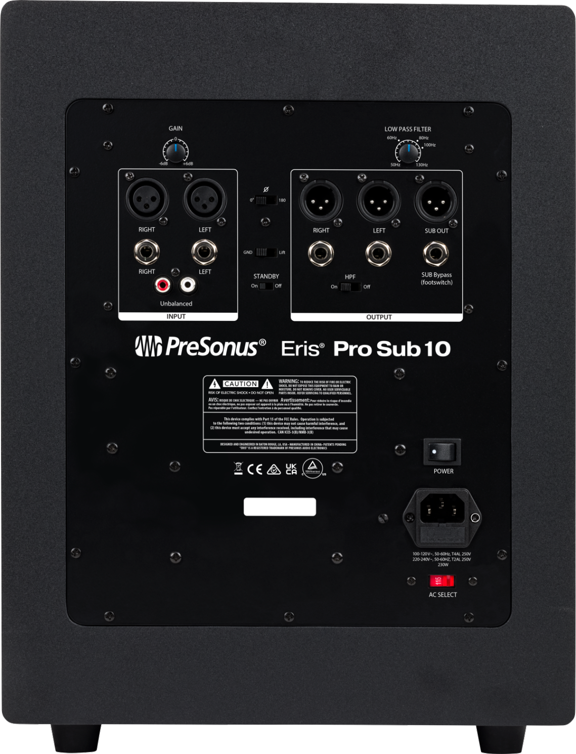 Powerful and musical, the PreSonus® Eris Pro Sub 10 active, front-firing studio subwoofer is designed to deliver fast and accurate transient response, extending low frequencies down to 20 Hz, allowing you to hear the full-spectrum range of your mix. Driven by 170W (RMS) Class AB amplification, the Eris Pro Sub 10's 10-inch, glass-composite, low-frequency driver delivers tight, responsive sub-bass, thanks to its lightweight and rigid cone.