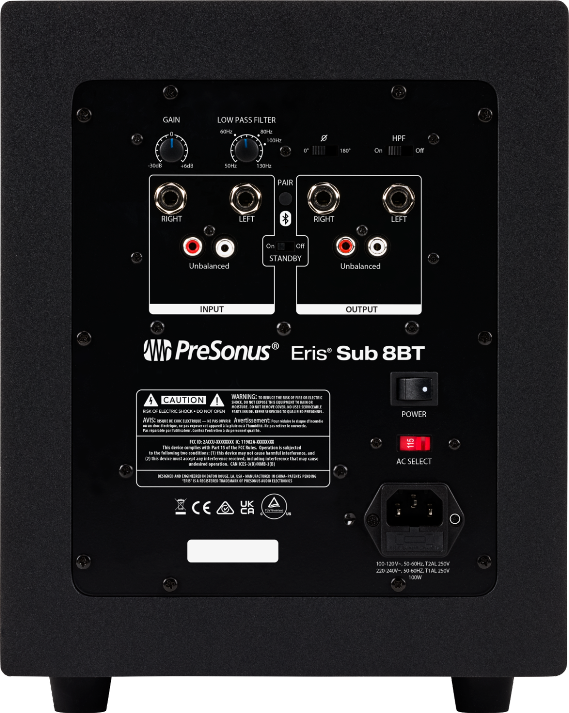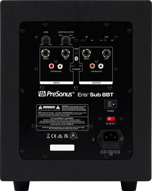 The first PreSonus® studio subwoofer to offer Bluetooth® 5.0 wireless connectivity, the Eris Sub 8BT provides flexible wired connection options, as well, making it easy to add a subwoofer to just about any monitoring setup. Onboard controls let you effortlessly create a 2.1 monitoring system and tune it to your room. Highpass filter and lowpass filter (crossover) controls ensure the Eris Sub 8BT starts working at the precise frequency where your main monitors stop, seamlessly extending the low-end of your monitoring setup.