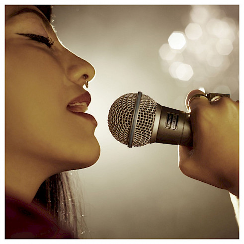 Dynamische zangmicrofoon, een aangepaste frequency response accentueert zang, de supercardioïde karakteristiek isoleert andere geluidsbronnen.
