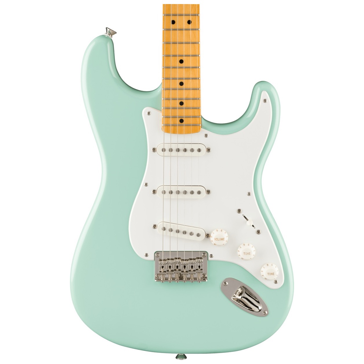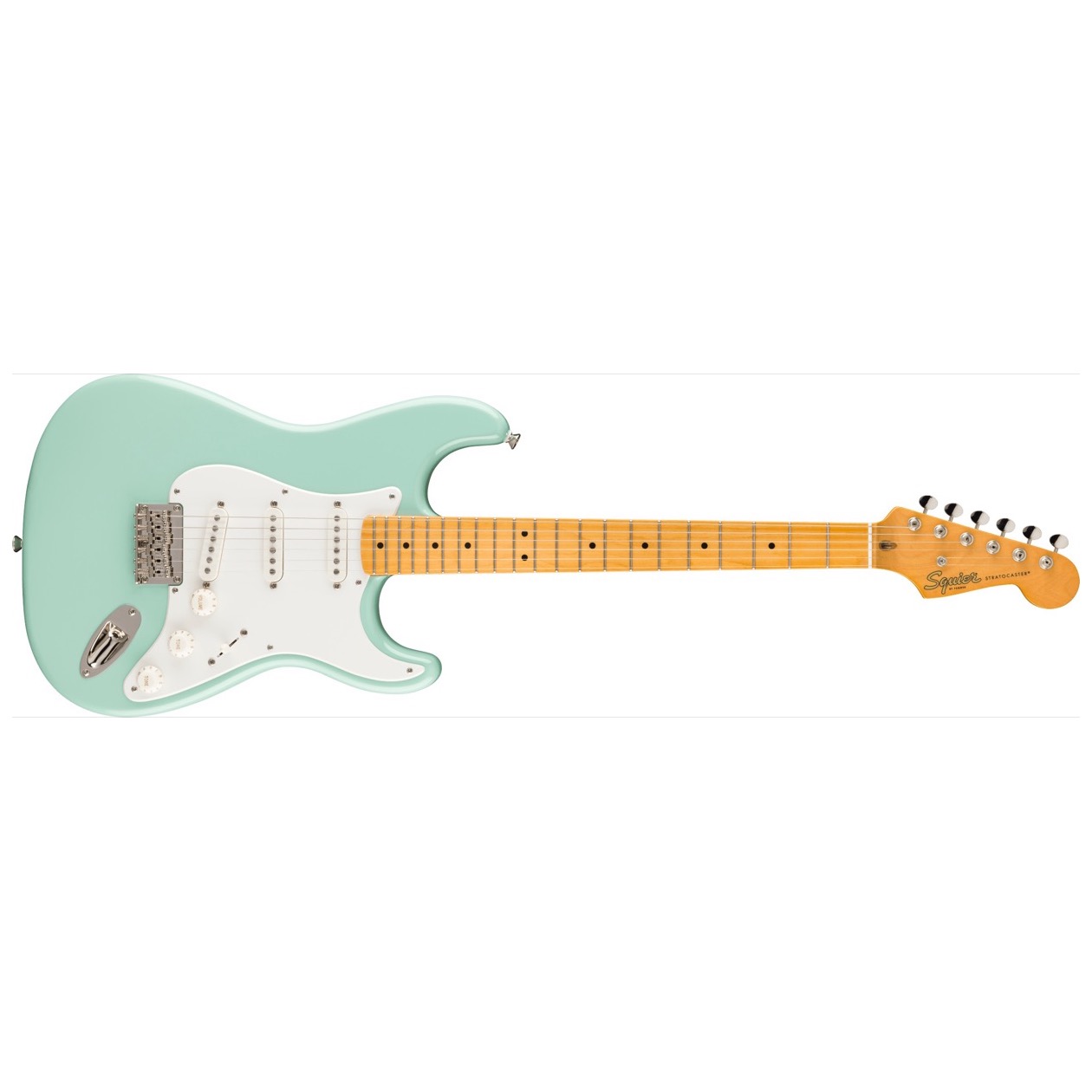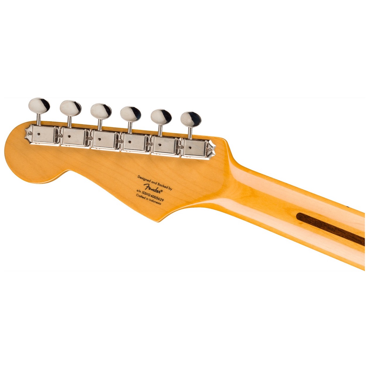 The maple fingerboard and single-ply pickguard of this model thoughtfully recall features of the earliest Stratocasters.