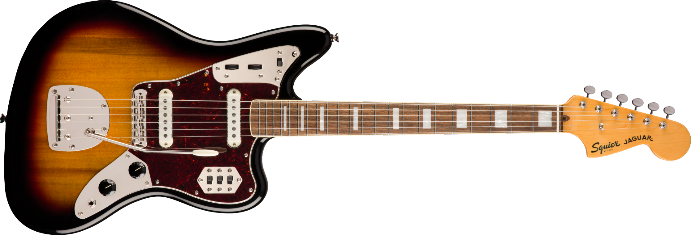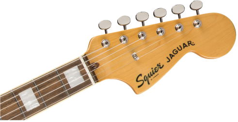 The Classic Vibe '70s Jaguar® turns up the volume on retro style and produces incredible tone courtesy of its dual Fender-Designed alnico single coil pickups. Small hands will appreciate the short 24" scale length and slim, comfortable "C"-shaped neck profile with an easy-playing 9.5"-radius fingerboard and narrow-tall frets. This Jaguar is faithful to the original with a vintage-style tremolo system for expressive string bending effects and floating bridge with barrel saddles for solid string stability. This throwback Squier model also features 1970s-inspired headstock markings, rich-looking nickel-plated hardware and a slick vintage-tint gloss neck finish for an old-school vibe.