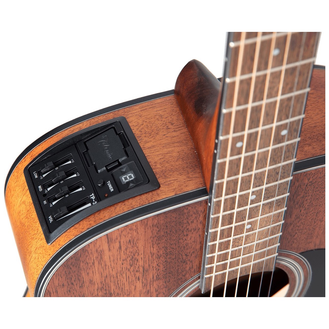 Takamine's GLD11E NS is a dreadnought shaped guitar with the benefit of a shorter scale length. This provides a softer, warmer sound due to the lowered tension of the 630mm scale. The okoume top combined with the okoume back and sides create a rustic, rootsy sound that delivers robust fundamental tones. Stage amplification is achieved through Takamine's TP-3G electronics. With its 3 band EQ and chromatic tuner, dialing in the right tone is easy!