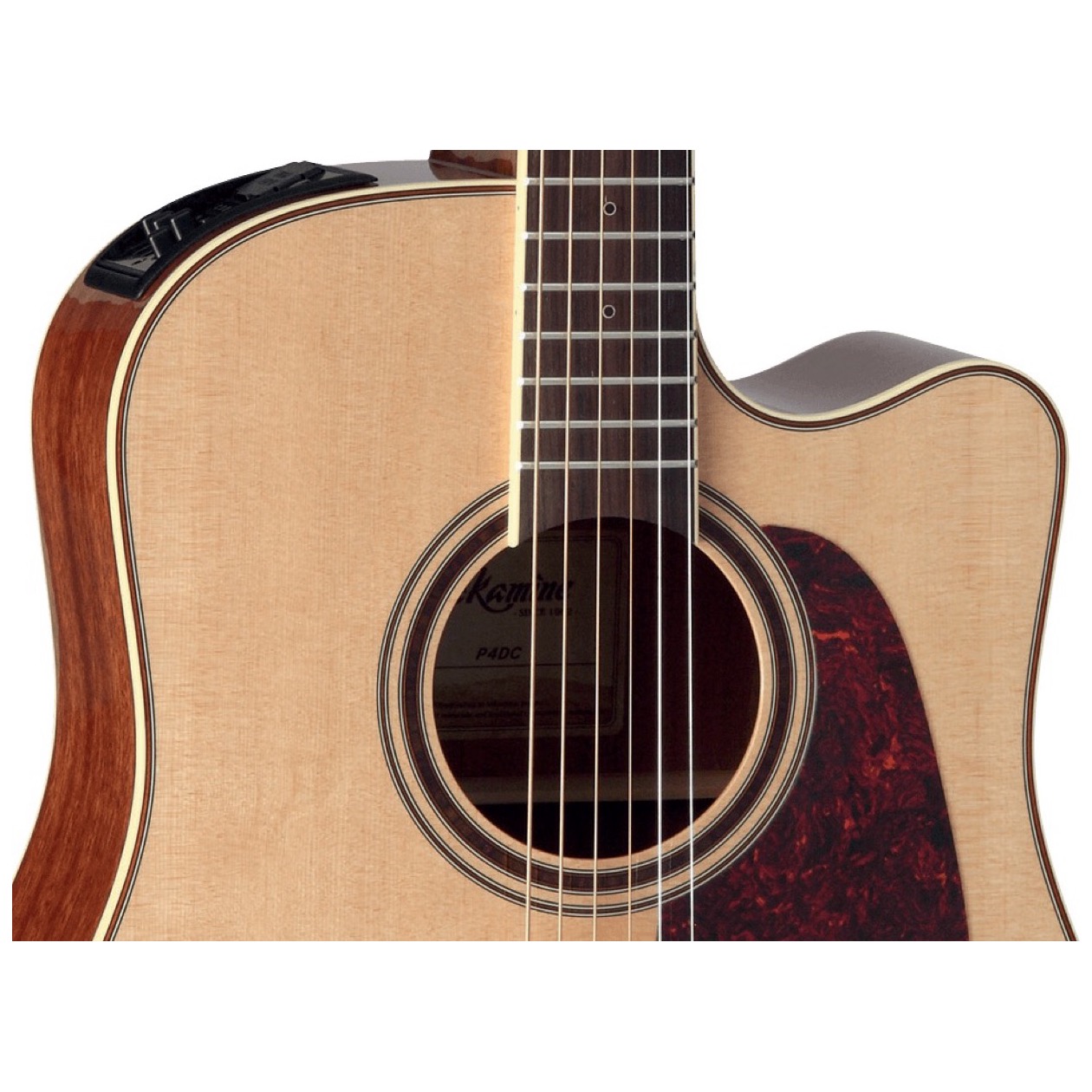 Takamine’s P4DC dreadnought cutaway combines tradition with contemporary refinements, including a resonant solid spruce top with “X” top bracing for superior clarity and projection, and a solid sapele back with sapele sides for rich, warm sound.