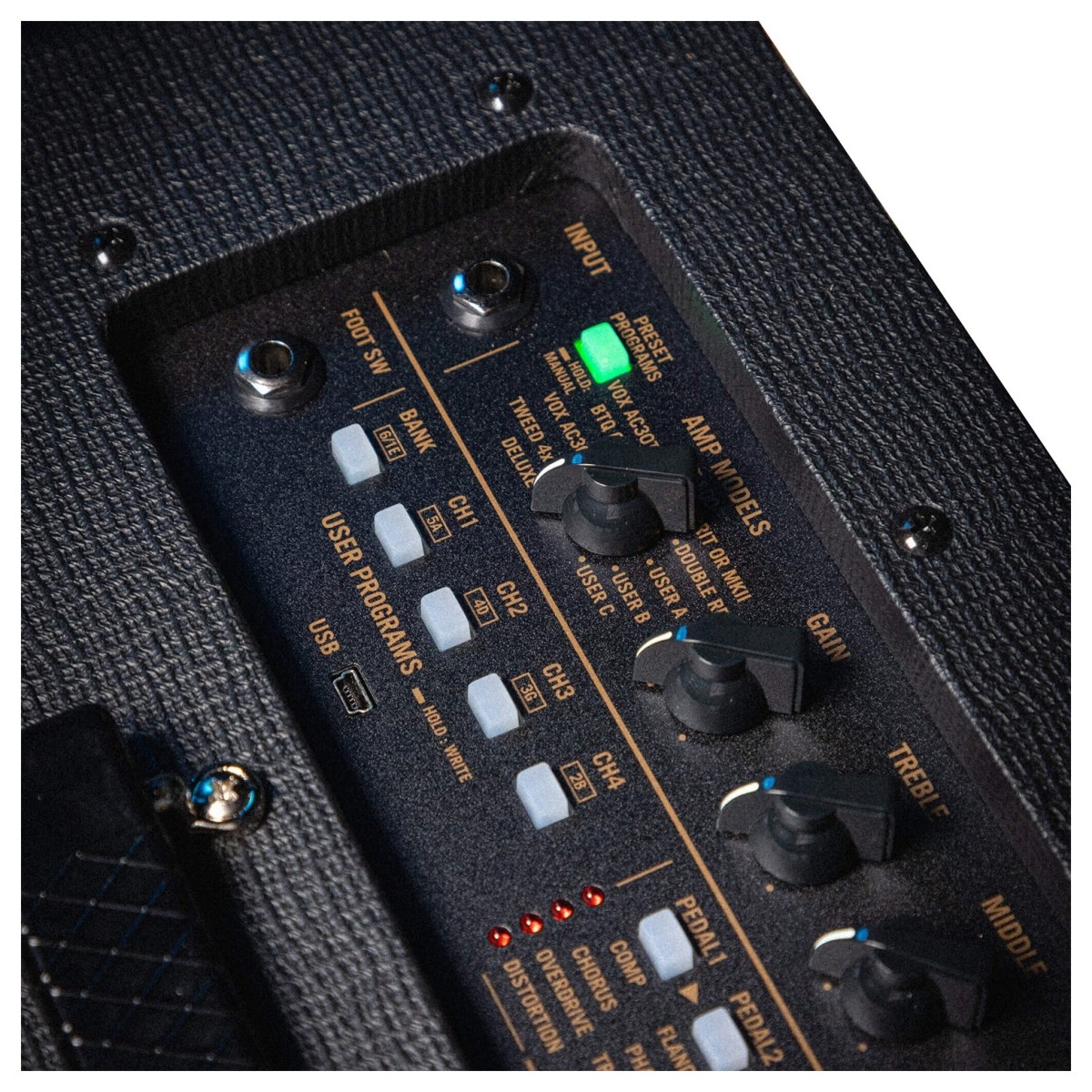 Nieuw ontworpen frontpaneel met een klassiekere VOX-esthetiek (Classic Blue)