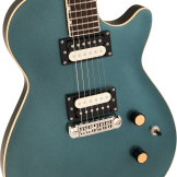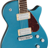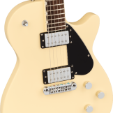 Key features include a shorter scale (30.3”), walnut fingerboard with 20 medium jumbo frets, two Gretsch mini dual